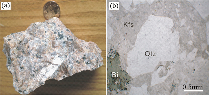 图 2 牯牛降花岗岩的野外照片(a) 和显微照片(b) Kfs-钾长石; Qtz-石英; Bi-黑云母 Fig. 2 Field photo (a) and photomicrograph (b) illustrating minerals of the Guniujiang granite Kfs-potassic feldspar; Qtz-quartz; Bi-biotite |