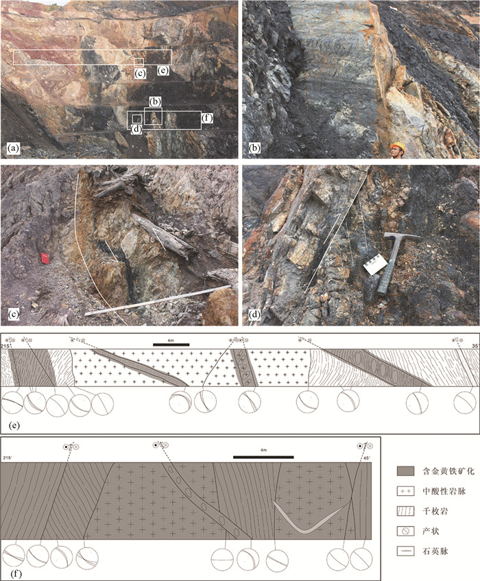图 5 老王寨矿段露天采场构造解析图解 (a)-老王寨露天采场全景;(b)-NW向中酸性脉岩与碳质千枚岩交界面阶步指示左行剪切性质;(c)-NW向含矿断裂中构造角砾排列方式指示其左行剪切性质;(d)-NW向含矿断裂一侧压性劈理面指示其逆断层性质;(e)-剖面显示含金黄铁矿化主要发育于NW向左行剪切逆断裂中;(f)-发育于含金黄铁矿化带中的断裂均为NW向左行剪切逆断裂 Fig. 5 Structural analysis of different structures in the Langwangzhai open pit (a)-open pit in Laowangzhai mine section; (b)-fault steps occurred in the interface between NW-striking dike and phyllite indicate the sinistral shearing; (c)-arrangement of breccias that occurred in NW-striking fault indicate the sinistral shearing; (d)-cleavage occurred in the NW-striking fault indicate the reverse property; (e)-profiles showing the mineralization mainly occurred in the NW-striking faults; (f)-profile showing the faults that occurred in the mineralization area are mainly NW-striking |