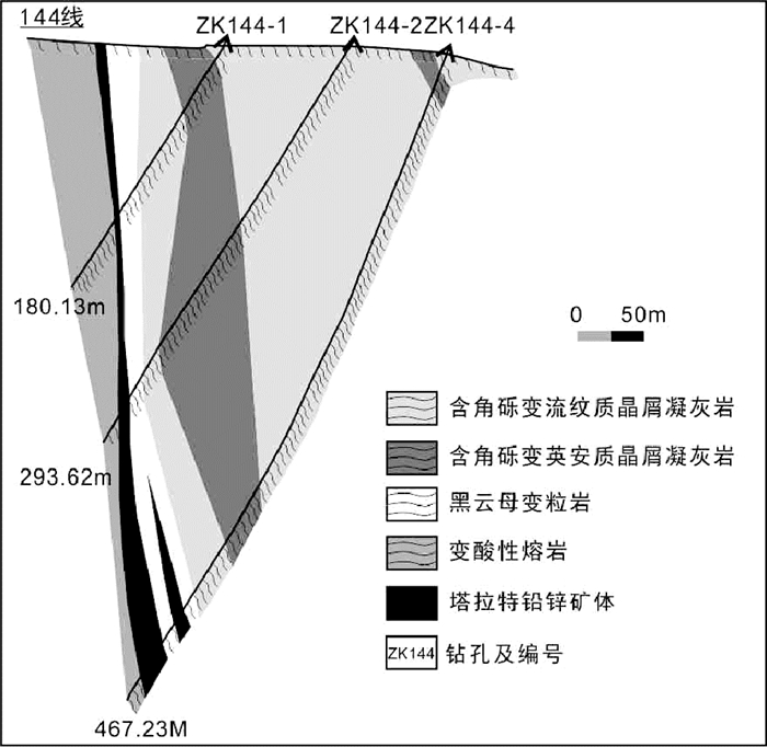 塔拉特铁铅锌矿整体沿北西方向展布,与断层和地层走向基本一致。北西段出露的矿体为Fe和Fe-Pb-Zn矿体,南东段为Fe-Pb-Zn矿体(图 2)。南矿段单矿体最厚达11m,走向延长约920m;Zn品位为1.14%~13.47%,平均2.24%;Pb品位0.51%~24.81%,平均2.03%;具有Zn>Pb的特点。矿体主要赋存于黑云母变粒岩、含角砾变英安质凝灰岩或变流纹质凝灰岩中,矿体呈脉状或透镜状。