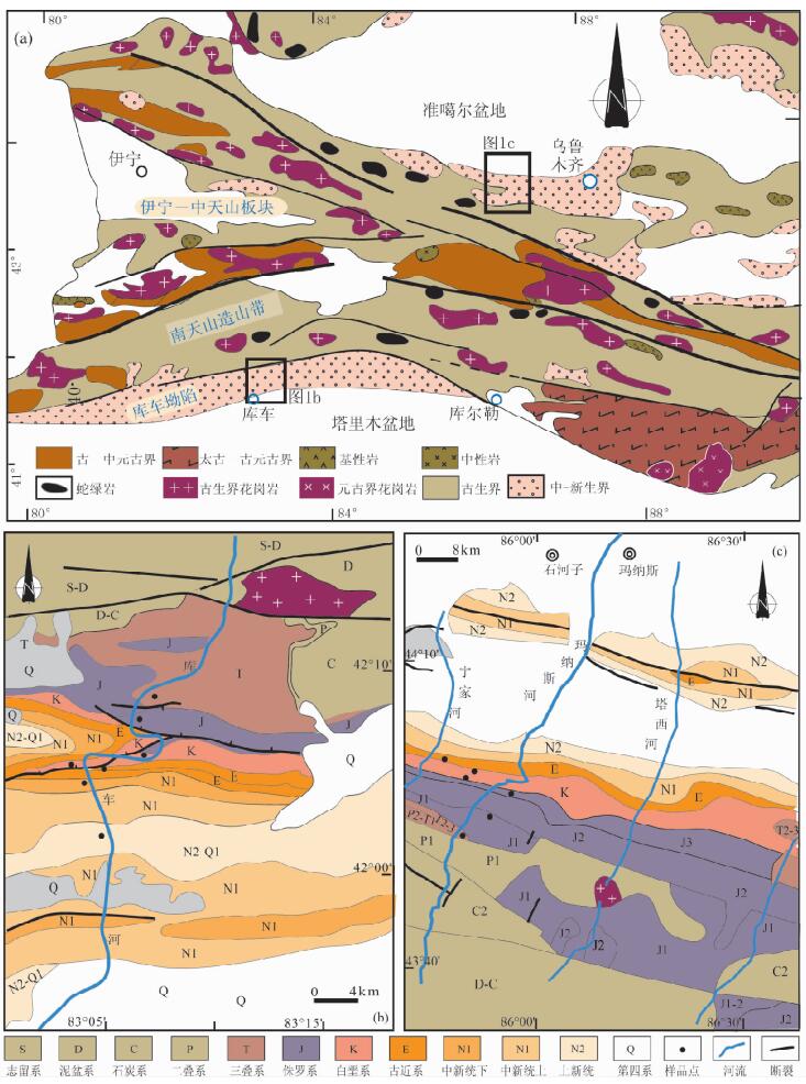 图 1 天山与邻区构造框架图(a)与天山南麓(b)、北麓(c)对比研究剖面位置 Fig. 1 Tectonic framework of the Tian Shan and its adjacent area (a), in which sampling outcrop profiles are prominently marked in the northern (b) and southern (c) piedmonts of Tianshan, respectively |