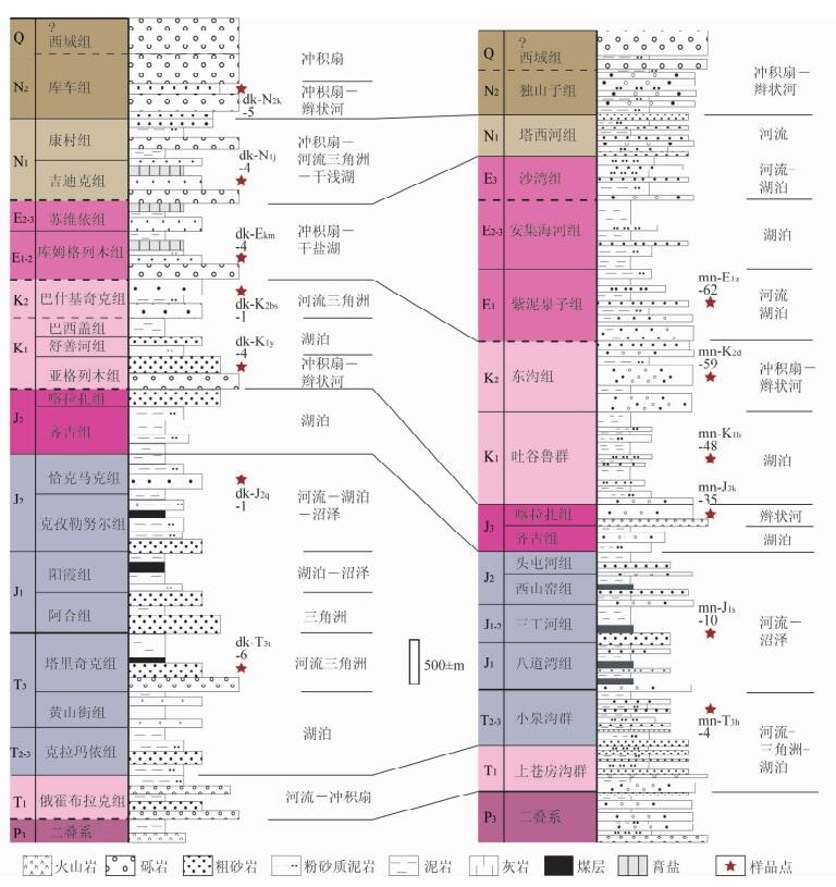 图 2 天山北麓、南麓典型中-新生界沉积序列对比及取样层位分布 Fig. 2 Typical depositional sequences of the Mesozoic-Cenozoic Rrathem occurred in the northern and southern piedmonts of Tianshan, in which sampling layers are prominently marked |