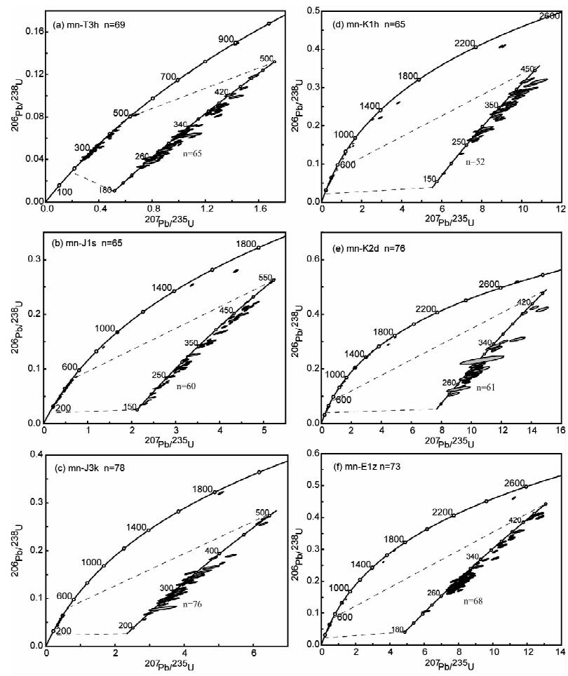 另外一个值得说明的是有关天山及邻近盆地中生代结晶岩的分布问题。除了西南天山的托云以及境外吉尔吉斯斯坦天山地区存在小规模的白垩-古近纪的碱性玄武岩和辉长岩体外(Sobel and Arnaud, 2000),较早的文献显示(新疆维吾尔自治区地质新疆维吾尔自治区地质矿产局,1993),研究区内仅在克拉玛依一带井下发现有197.5~218Ma (K-Ar法,转引自中国科学院地球化学研究所研究报告)中酸性和基性火山岩和170.6Ma (K-Ar法)中基性火山岩;而燕山期侵入岩仅见于阿尔金山拉配泉一带,主要为造山后碱性花岗岩,年龄120.7Ma (K-Ar法)。而新的研究又陆续在克拉玛依西蚊子沟发现早侏罗世玄武岩(Ar-Ar法192.7Ma,徐新等,2008),在东北天山发现三叠纪黑云母花岗岩(Ar-Ar法238.0Ma、K-Ar法217.1~232.0Ma,许英霞等,2008)以及相关的早中生代成矿事件。鉴于上述,三叠纪和早-中侏罗世可能属于后碰撞或陆内裂陷作用形成的结晶岩在北天山及邻近盆地(特别是准噶尔盆地)分布的事实是客观存在的,它们也可能是天山山前中-新生界碎屑锆石的可能来源(包括再旋回物源)。
