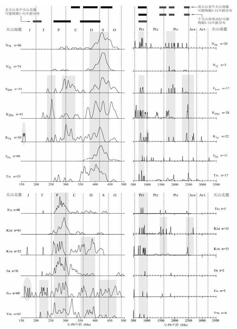 图 4 天山北麓(图下半部)与南麓(图上半部)中-新生界碎屑锆石U-Pb年龄相对频数分布与对比图 每个样品U-Pb年龄分布150~500Ma和500~3500Ma分别作图;天山锆石U-Pb年龄分布统计(图顶部,数据来源参见正文及图 6说明):黑色条带表示主要物源(剥露显著),灰色条带表示次要物源(剥露不显著).天山北麓自下而上样品序列:T3h-上三叠统郝家沟组, J1s-下侏罗统(中侏罗统?)三工河组, J3k-上侏罗统喀拉扎组, K1h-下白垩统呼图壁组, K2d-上白垩统东沟组, E1z-古新统紫泥泉子组; 天山南麓自下而上样品序列: T3t-上三叠统塔里奇克组, J1q-中侏罗统恰克马克组, K1y-下白垩统亚格列木组, K2bs-上白垩统巴什基奇克组, Ekm-古-始新统库姆格列木组, N1j-中新统吉迪克组, N2k-上-更新统库车组 Fig. 4 Probability plots for detrital zircon ages of the studied Mesozoic-Cenozoic sandstone samples from the northern piedmont of Tian Shan and their comparison with that of the southern piedmont of Tian Shan |