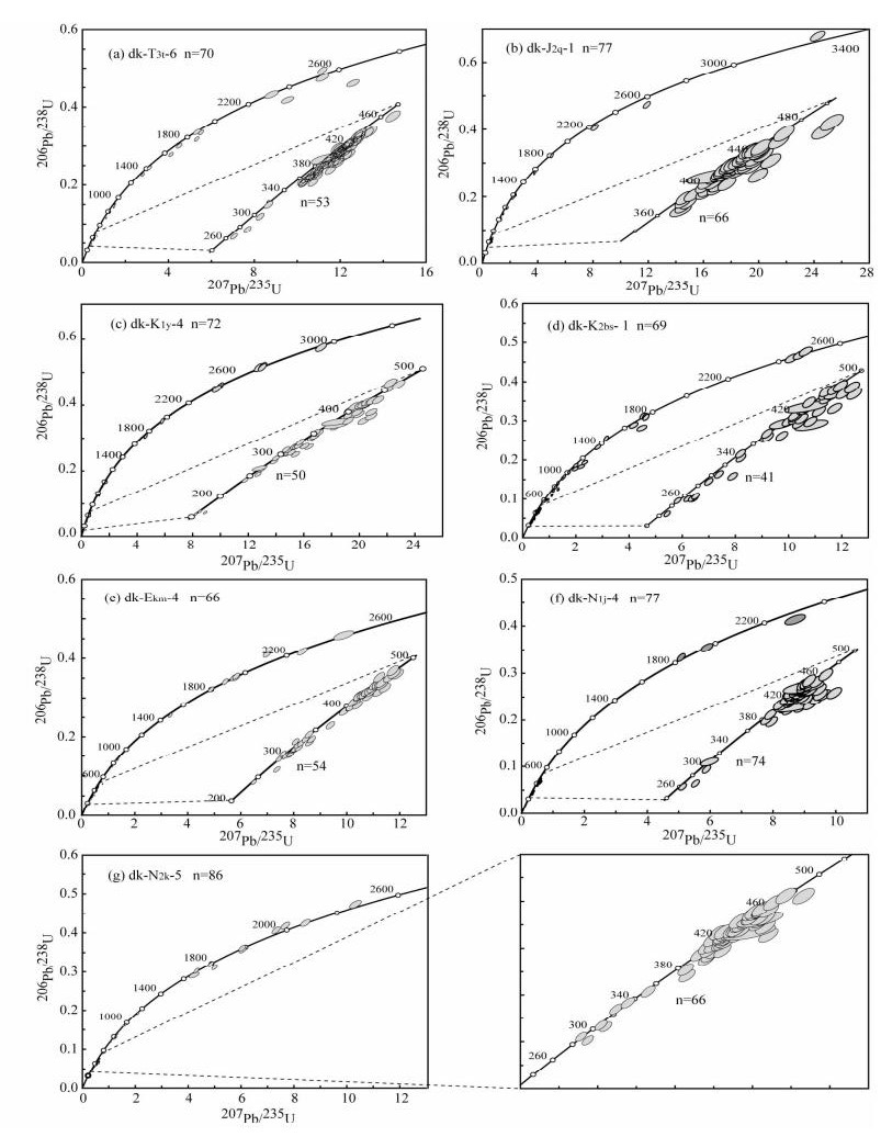 图 5 天山南麓碎屑锆石U-Pb年龄谐和图 (a)-上三叠统塔里奇克组; (b)-中侏罗统恰克马克组; (c)-下白垩统亚格列木组; (d)-上白垩统巴什基奇克组; (e)-古-始新统库姆格列木组; (f)-中新统吉迪克组; (g)-上-更新统库车组.图 5b, c, e-g数据见Li et al.(2010) Fig. 5 Concordia plots for detrital zircon U-Pb ages of sandstone samples from the southern piedmont of Tian Shan |