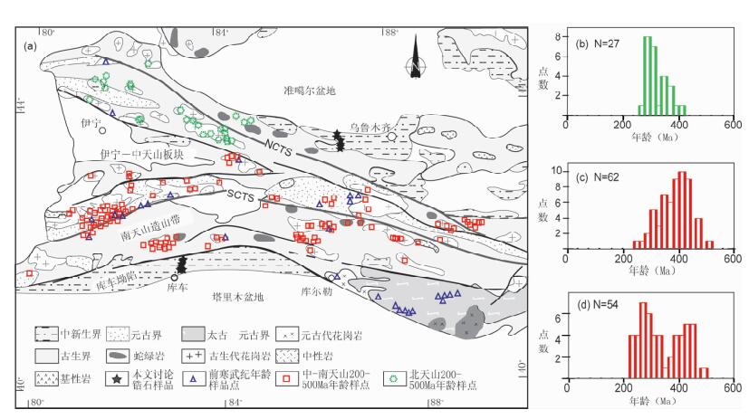 图 6 天山地区结晶岩U-Pb同位素年龄数据分布图(a)和不同块体显生宙年龄统计直方图(b-d) (a)-主要样品位置; 显生宙年龄统计直方图统计:北天山区(b); 中天山区(c); 南天山区(d). 2007年前发表的大部分数据来源:转彭守涛(2007)统计结果, 参考文献在此从略; 其他补充数据来源: 朱宝清等, 2002; 朱永峰等, 2005; 杨海波等, 2005; 龙灵利等, 2007; 朱志新等, 2006a, b, 2008a, b; 杨天南等, 2006, 杨天南和王小平, 2006; 王超等, 2007; 罗金海等, 2008; 王博等, 2007a, b; 马中平等, 2007; 王守敬和王居里, 2010; 朱永峰等, 2010; 杨经绥等, 2011; 李继磊等, 2010; 牛贺才等, 2010; Gao et al., 2009, 2011; Su et al., 2010; Qian et al., 2009; Wang et al., 2009, 2011; 郑建平等, 2005; Yang and Zhou, 2009; Zhang et al., 2007; Long et al., 2008; 陈义兵等, 1999; 徐学义等, 2006a, b; 唐功建等, 2009; 白建科等, 2011; Han et al., 2010; 王飞等, 2010.天山前寒武纪基底年龄统计可参见Ma et al. (2012)及Shu et al. (2011),在此从略 Fig. 6 Distribution of the published U-Pb isotopic data on crystalline rocks over Tian Shan area (a) and statistical number histograms (b-d) on the Phanerozoic U-Pb ages for elementary blocks making up of the Tian Shan |