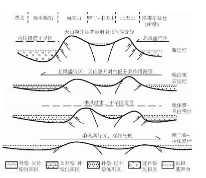 (3) 陆内构造变形和局域深部(隐伏)岩浆活动控制了天山地区山盆隆坳演化和构造古地理关系,但区域古气候演变、天山隆升造成的局域气候分异也是天山南北麓盆地沉积演化的重要因素;本文认为晚侏罗世-早白垩世拉萨板块在欧亚板块南缘的碰撞事件确实导致了研究区强烈的陆内构造变形,以及气候-沉积演化的重要转折,天山的隆升也造成南北局域气候-沉积记录趋于分异,但这种分异在新近纪以前是有限的。