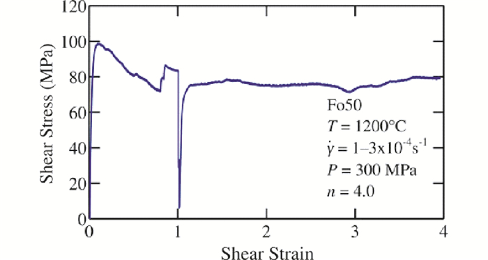 图 3 富铁橄榄石集合体试件外边缘的剪应力剪应变关系 峰值应力与三轴压缩试验得到的位错蠕变流动的应力应变关系相吻合(据Zhao et al., 2009) Fig. 3 The shear stress versus shear strain at the outside edge of the torsion sample The peak stress agrees well with dislocation creep flow law for Fe rich olivine aggregates determined in triaxial compression experiment (after Zhao et al., 2009) |