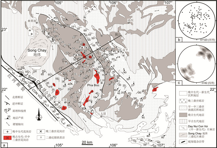 越南东北部Song Chay构造带呈WNW-ESE走向, 位于华南板块的南部(图 2)。受印支运动的影响, 发育一系列的构造和岩浆作用(Lepvrier et al., 2011)。该构造带位于特提斯构造域与太平洋构造域的交汇处, 保存了晚二叠世以来华南板块与周缘板块碰撞拼合印记, 记录了丰富的中生代变形构造形迹, 是研究华南板块南缘中生代构造变形的关键区域(Lepvrier et al., 2011及其相关参考文献)。该地区构造学的研究非常有限(Deprat, 1914; Fromaget, 1932; Yan et al., 2006; Lepvrier et al., 2011), 近期的工作大多集中在同位素年代学和地球化学上(Roger et al., 2000, 2012; Maluski et al., 2001; Yan et al., 2003; Hoa et al., 2008)。这些零散而不全面的工作为我们认识华南板块南缘的印支期事件带来了很大的困难(林伟等, 2011)。本文对Song Chay构造带进行详尽的构造解析, 结合精确的年代学数据对越南东北部地区的构造变形进行年代学约束, 并在此基础上讨论其地球动力学的成因背景。