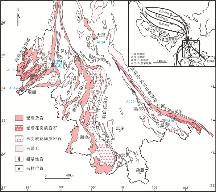 高黎贡山杂岩带位于保山地块和腾冲地块之间的高黎贡山脉,是一条与深断裂活动有关的构造岩浆变质杂岩带(范承钧, 1982),东侧以怒江断裂为界,与保山地块相连,西侧以实皆断裂为界,与密支那地块相连(李再会等, 2012b),主体是一套遭受强烈变形的变质岩系(包括高黎贡山群和公养河群)。该杂岩带东西两侧为变质程度较低岩石,中间混合岩化作用强烈,形成混合岩以及混合花岗岩。经历了深变质作用、被认为是腾冲地块变质基底(钟大赉,1998) 的高黎贡群岩石组合以片麻岩、变粒岩、角闪质岩石为主,岩石普遍混合岩化。原岩建造可能为一套夹基性火山岩的砂泥质复理石建造。实际上,原高黎贡山群至少部分是具片麻岩外貌的年轻花岗岩。另外,分布于高黎贡山脉西坡和龙川江东岸的一套浅变质岩系(千枚岩、板岩、结晶灰岩和微晶片岩) 可能时代为下元古界。因此,重新定义的高黎贡山群仅指泸水-瑞丽韧性推覆断层上盘产出的,达角闪岩相变质的岩石(黑云斜长片麻岩、花岗片麻岩、混合岩、云英片岩、斜长角闪岩、大理岩及石英岩),局部可达麻粒岩相(季建清, 1998; 季建清等, 2000),其形成时代可能是中-新元古代(钟大赉, 1998)。高黎贡山杂岩带内出露多时期的花岗质岩石,包括元古代、中生代和新生代花岗质岩石(钟大赉, 1998; 赵成峰, 2000)。其中元古代花岗质岩石呈北东-南西向展布,主要出露于潞西-瑞丽西北地区,两侧为中元古代和晚元古代花岗闪长岩。研究区中生代花岗岩出露面积较大,且呈带状分布,自东而西依此为早白垩纪-晚侏罗纪东河花岗岩带、晚白垩古永花岗岩带和早第三纪槟榔江花岗岩带新生代花岗岩,按岩石类型可划分为二长花岗岩、正长花岗岩、白云母花岗岩和白云母钠长花岗岩等(董方浏等, 2006)。新生代花岗岩主要分布于盈江-潞西一线以北,花岗岩体大致呈南北向展布。陈吉琛(1989)按照花岗质岩石形成的构造环境进一步划分为三种类型,即盈江-腾冲以北为弧后环境的花岗岩,盈江-腾冲和瑞丽潞西之间为断裂变质花岗岩,瑞丽-潞西以南为地幔热点环境的花岗岩。部分研究者将该区花岗岩划分为碰撞前燕山期花岗岩和碰撞期新生代花岗岩,碰撞前燕山期花岗岩与新特提斯洋壳板片的俯冲有关;碰撞期新生代花岗岩与燕山期花岗岩相依分布,早期富钾花岗岩集中于腾冲-梁河一带,而晚期二云母花岗岩集中于察隅-波密一带(吕伯西等, 1993)。(图 1)