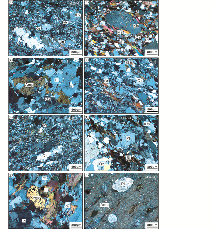 图 2 “三江”地区花岗质岩石显微照片(正交偏光) Amp-角闪石;Bt-黑云母;Kfs-钾长石;Ms-白云母;Pl-斜长石;Pth-条纹长石;Qz-石英 Fig. 2 Micro-textures of granitoid rocks in Sanjiang complex belt (CPL) |