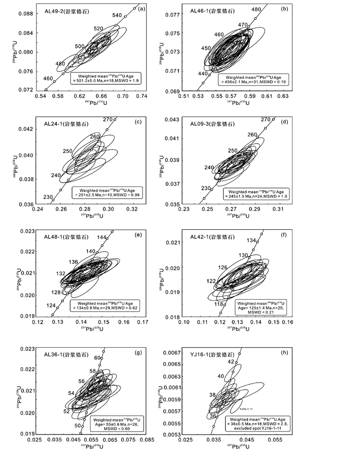 黑云母二长岩(AL36-1):采用LA-ICP-MS技术对26个岩浆锆石微区进行测试,年龄测试结果列入表 7中,相应的206Pb/238U-207Pb/235U年龄谐和图见图 3g。岩浆锆石U含量为148×10-6~1144×10-6,Th含量为96×10-6~673×10-6,Th/U比值为0.34~1.18,锆石206Pb/238U年龄变化于57~53Ma,加权平均年龄为55±0.6Ma (MSWD=0.6,n=26),此年龄应代表该花岗岩的侵位年龄。