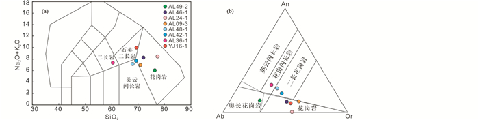 图 4 云南“三江”地区花岗质岩石图解 (a)-TAS图解(据Middlemost, 1994); (b)-An-Ab-Or图解(据O’connor, 1965; 虚线为Barker, 1979修正边界线) Fig. 4 Diagrams for classification of granitoid rocks in Sanjiang area, Yunnan Province (a)-TAS diagram (after Middlemost, 1994); (b)-An-Ab-Or diagram (after after O'connor, 1965; the dashed lines cited from Barker, 1979) |