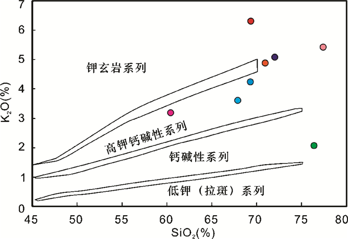 图 5 云南“三江”地区花岗质岩石SiO2-K2O图解(据Rickwood,1989) Fig. 5 Si2O-K2O diagram for granitoid rocks in Sanjiang area, Yunnan Province (after Rickwood, 1989) |