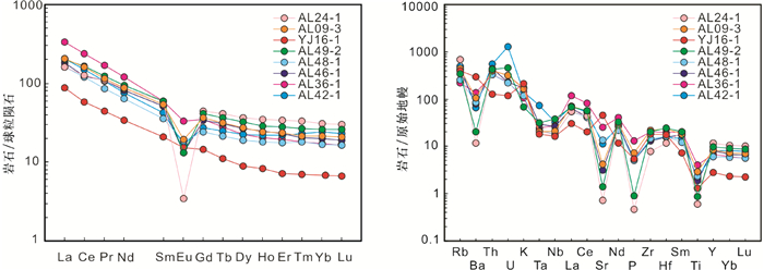 微量和稀土元素方面,Sr含量为15.1×10-6~955×10-6,Zr含量为87.1×10-6~249×10-6,Hf含量为3.58×10-6~7.49×10-6,Y含量为12.8×10-6~53.8×10-6。轻重稀土分异明显,轻稀土相对富集,(La/Yb)N值变化于5.22~19.56。除样品YJ16-1具有较低的稀土元素总量(∑REE=102×10-6) 和弱的负铕异常(Eu/Eu*=0.87),其他样品具有相对一致的稀土配分型式,稀土总量为203×10-6~361×10-6;Eu/Eu*=0.07~0.74(图 6a、表 9)。在微量元素分布蛛网图(图 6b) 上,显示出Nb、Ta、P、Ti的负异常。除YJ16-1外,其他样品还表现出Sr的负异常。