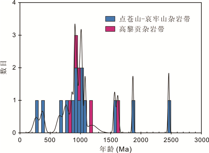 7.2 结晶基底“三江”地区杂岩带是否存在前寒武纪古老结晶基底、形成时代及其构造归属,目前仍存在分歧。长期以来,地质学家针对变质杂岩带内不同岩石类型进行大量同位素年代学测试研究,越来越多的前寒武纪的年龄相继报导。云南省地质矿产局(1990)在总结云南区域地质概况时,认为在“三江”地区古老的结晶基底分布规模十分有限,零星分布于变质杂岩带中。在点苍山-哀牢山地区,翟明国等(1990)对哀牢山群斜长角闪岩进行研究得到1367Ma的Sm-Nd等时线年龄;翟明国和从柏林(1993)根据变质沉积岩和花岗质片麻岩的同位素年龄,确定点苍山地区存在20亿年前的古老陆壳;钟大赉(1998)报道苍山群和哀牢山群斜长角闪岩Nd模式年龄分别为1492~1402Ma和1900~1600Ma。近年来,随着定年技术尤其是锆石U-Pb定年技术的发展,更多精确的年代学数据相继发表。点苍山-哀牢山杂岩带中获得了大量新元古代锆石U-Pb年龄(刘俊来等, 2008; 李宝龙等, 2010; Qi et al., 2012)。钟大赉(1998)通过研究得到高黎贡群斜长角闪岩和花岗片麻岩Nd模式年龄分别为1094~840Ma和2717~2218Ma;李宝龙等(2010)对高黎贡山杂岩带内糜棱岩进行SHRIMP锆石U-Pb定年,获得524±6.6Ma的岩浆年龄,认为“三江”杂岩带普遍存在前寒武纪变质基底,只是受到三叠纪等后期岩浆作用影响,基底被强烈改造而零星出露。我们对点苍山-哀牢山杂岩带和高黎贡杂岩带花岗质岩石进行锆石U-Pb年代学研究,在样品中发现一些古太古代晚期-中生代的捕获锆石。其中大多数捕获锆石的年龄分布在1100~800Ma之间(图 7),这与前人在该地区获得的新元古代年龄一致(刘俊来等, 2008; 李宝龙, 2010),指示该地区可能存在新元古代岩浆作用。而少量古-中元古代锆石的存在,指示该地区可能存在更古老的基底物质。这与Nd同位素结果相一致。这些花岗质岩石的Nd的模式年龄大致可以分为两期:其中三件的tDM为1969~1735Ma,另外两件为1297~1070Ma。结合前人在该地区获得的Nd模式年龄(钟大赉, 1998),指示该地区可能存在古元古代和中-新元古代的基底岩石。