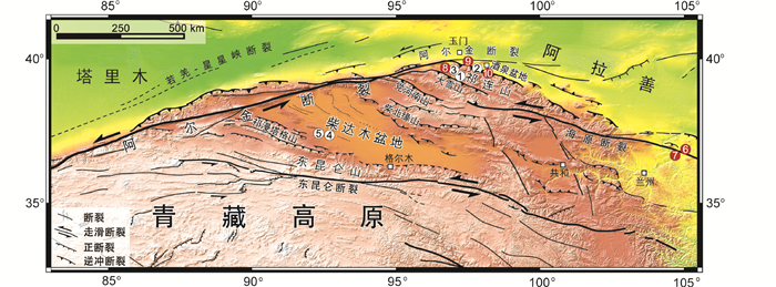 2 地质背景印度板块与亚洲板块碰撞以来,青藏高原东北部有三条大型左行走滑断裂活化,即: (1) 阿尔金左行走滑断裂、(2) 东昆仑左行走滑断裂和(3) 海源左行走滑断裂。其中,阿尔金左行走滑断裂形成于印支期,在中生代强烈活动,为本区最为重要的断裂。阿尔金断裂切割了青藏高原北部的不同构造单元,并控制青藏高原北部的地貌特征及基本的构造格架。受上述三条左行走滑断裂控制,本区整体表现为由一系列NWW-SEE走向的推覆和走滑断裂组成的挤压转换盆-岭构造地貌域,自南向北主要山脉有东昆仑山、柴北缘山、党河南山、大雪山、祁连山等,主要的山间盆地有柴达木盆地、党河盆地、昌马盆地等。其中酒泉盆地为祁连山的新生代前陆盆地,长度约1000km,宽20~80km,西以阿尔金走滑断裂为界,南以北祁连北缘逆冲推覆带与祁连山连接(许志琴等, 2006, 2007, 2011;Tapponnier et al., 2001;李海兵和杨经绥, 2004; 李海兵等,2006;孙知明等,2012)。本文涉及到的主要构造及地貌单元位置见图 1。