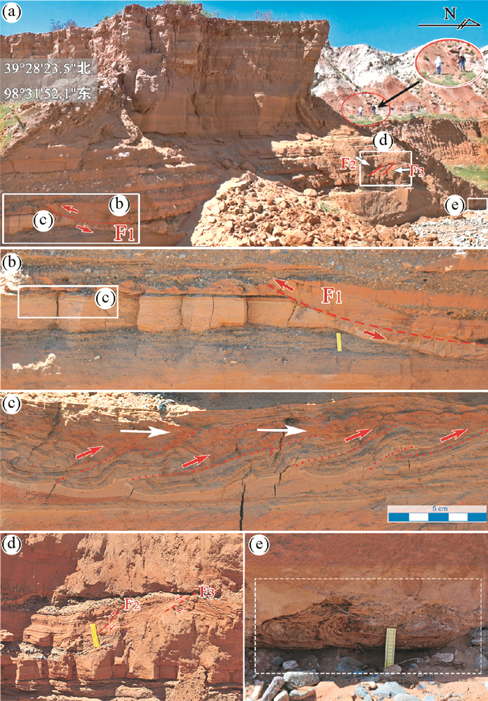 图 10 酒泉瓷窑口全新统滑塌变形、枕状构造与层间微断层 (a) 全景图,右上角两名地质工作者为参考比例;(b) 同沉积微型逆断层(F1) 和滑塌构造:F1向北倾斜,倾角平均20°,其上界未切穿上覆砂砾岩层;(c) 滑塌构造放大照片,其中的红色箭头显示滑塌构造中的4条微型逆冲断层,白色箭头显示滑塌的总方向;(d) 层间逆断层,断层倾角分别为42°和30°,注意F2和F3也是层间断层,断层严格产于单一层内;(e) 枕状构造,说明见正文 Fig. 10 Photos showing the slump, pillow structures and intrastratal faults found at Ciyaokou village, Jiuquan City |