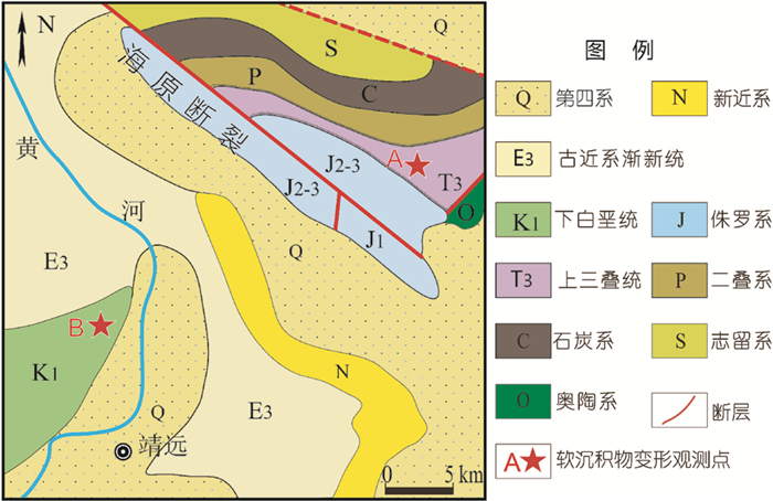 软沉积物变形观测点位于上三叠统北东向展布与北西向展布的转折端附近,距靖远县城直线距离约32km,GPS坐标为:36°46′18.21″北和104°55′9.66″东(图 1⑥、图 2A)。