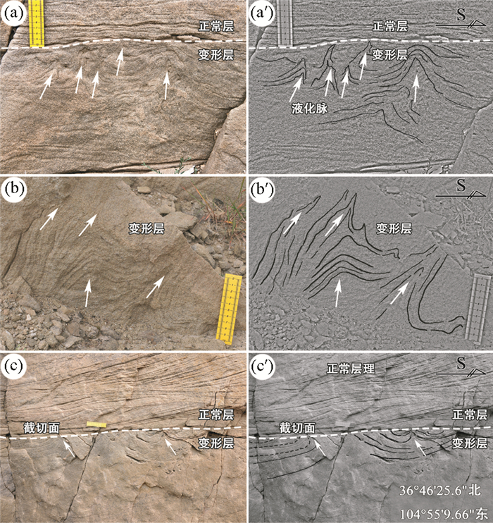图 3 宝积山附近上三叠统砂岩中的液化变形(镜头朝东) (a-a′):液化脉与曲卷变形:同一变形层内的液化变形程度呈较明显的分带现象,上部变形强烈,下部向正常岩层逐渐过渡;(b-b′):强烈变形部位,整层砂岩液化;(c-c′):发育不完好的枕状构造,变形上部被侵蚀截切,变形层之上为正常沉积.白色箭头为液化沉积物的流动方向 Fig. 3 Liquefied soft-sediment deformation types in the Upper Tertiary at Baojishan, Gansu Province |