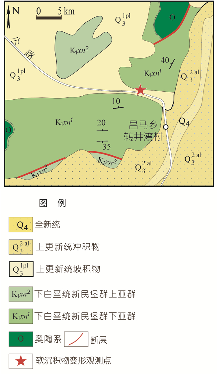 昌马盆地位于阿尔金断裂的北东端,西距阿尔金主断裂仅数十千米。盆地南缘与北缘均为向南逆冲的断裂。很明显,昌马盆地的形成与阿尔金断裂的左行走滑运动密切相关。据物探资料,侏罗纪、白垩纪时,昌马盆地在南北向的拉伸作用下, 形成了一系列近东西向、北西西向的同沉积正断层(王胜利等,2001)。新民堡群中的软沉积物变形的发现,可认为是这些同沉积断层存在的直接证据。