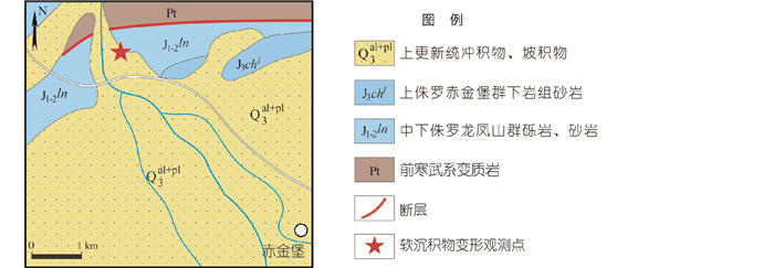 图 7 赤金堡更新统中软沉积物变形点地质简图(据甘肃省地质局,1972①) Fig. 7 Geological map showing the soft-sediment deformation structures' location in the Pleistocene at Chijinpu, Yumen city |