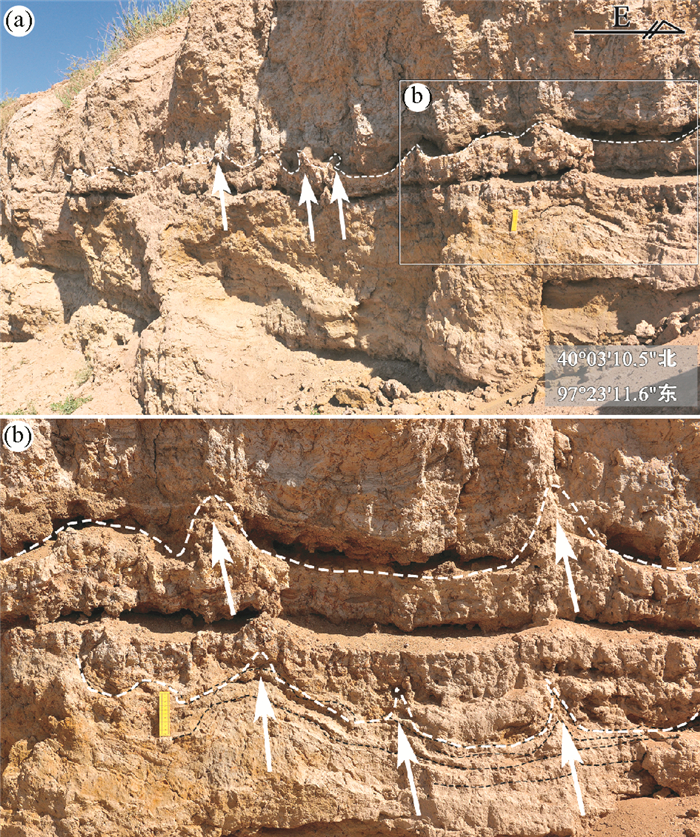 图 8 玉门赤金堡更新统中的液化现象 白色箭头代表液化沉积物的流动方向.(a) 全景照片,注意变形层的界线分布非常平直,说明其整体形成于弱动力的静水整环境;(b) 为近景照片,显示上下两层砂质粘土层内均发生了变形,白色产状指示液化方向 Fig. 8 Liquefied diapirs in the Pleistocene near Chijinpu village, Yumen City |