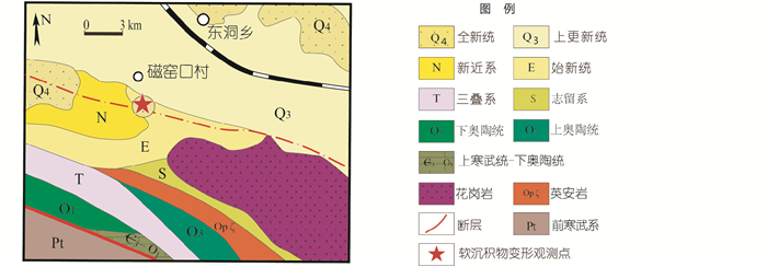 图 9 酒泉磁窑口村全新统液化变形点地质简图(据潘桂堂和丁俊,2004改编) 本图中的变形点为图 1中的位置⑩ Fig. 9 Geological map showing the soft-sediment deformation structure' location in the Holocene at Ciyaokou village, Jiuquan City (after Pan and Ding, 2004) |