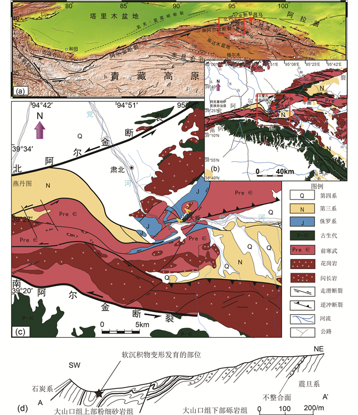 图 1 肃北区域地质图 图(d) 剖面位置见图(c) A-A’剖面,侏罗系地层出现褶皱,应力方向与阿尔金左旋走滑一致,软沉积物变形发现在该套沉积地层上部泥岩和粉砂岩中;红色圆圈为图 2剖面所在位置 Fig. 1 Geological map of Subei The cross-section A-A'marks the location of the cross section d. Note the stress direction consistent with the sinistral movement of the Altyn Tagh fault system. The black pentagon represents the location of soft sediment deformation; the red cycles mark the location of lithological column in Fig. 2 |