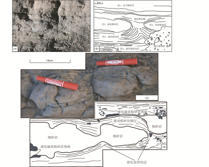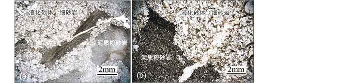 液化角砾构造地震成因解释:液化角砾形成时围岩一般为固结或半固结状态,一般形成与沉积层形成一段时间之后,要求十分强烈的地震动条件,这一现象在我国四川盆地、塔里木盆地及南悉尼盆地都有发现(乔秀夫等,2012;何碧竹等,2010;杜远生等,2007)。图 10中黑色粉砂质角砾被细砂岩包裹,黑色泥质粉砂岩为原位岩层,地震时黄色细砂层液化剧烈液化并挤入该层,将其撕裂成具有可拼贴性的角砾状,角砾可能经过了极短距离的搬运,多为尖棱角状,两者之间的交切关系可见图 10b,显微构造显示黄色细砂层作为主动层,刺入黑色泥质粉砂层中。