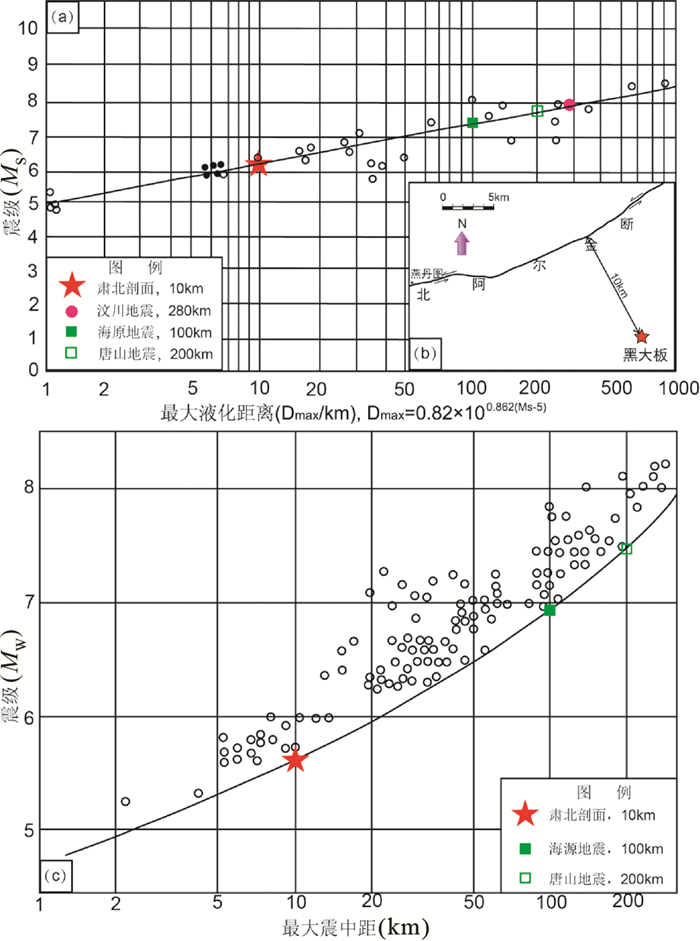 图 12a是刘颖和谢君斐(1984)统计我国1955年以来,900年历史地震与记录到的最大液化距离之间的经验关系,这一统计关系理论上适用于我国大部分地区,统计的地震样本值大都来自历史上对这些地区的记录,为验证这个统计经验公式,我们采用唐山、海城和汶川地震进行验证,如图所示,绿色方框代表我国唐山、海城地震、汶川地震(官方震级分别为MS 7.3,MS 7.8和MS 8.0级),计算所的到海城地震震级为MS 7.4级(最大液化距离100km),唐山地震震级为MS 7.8级(最大液化距离200km),汶川地震震级为MS 7.9(最大液化距离280km,到达甘肃省陇南市,(曹振中等,2010))。依据我们发现的软沉积变形剖面到北阿金断裂的距离10km计算,肃北剖面在这里对应震级在MS 6~6.5之间;同样的,应用Ambraseys (1988)的统计规律计算,肃北剖面对应的最小震级大于MW 5.5(图 12c),由于Ambraseys统计样本同时包括了多种地质、场地环境,对应的震级普遍偏小,在本文中作为可能震级的下限,唐山和海城地震在该图上明显偏小。