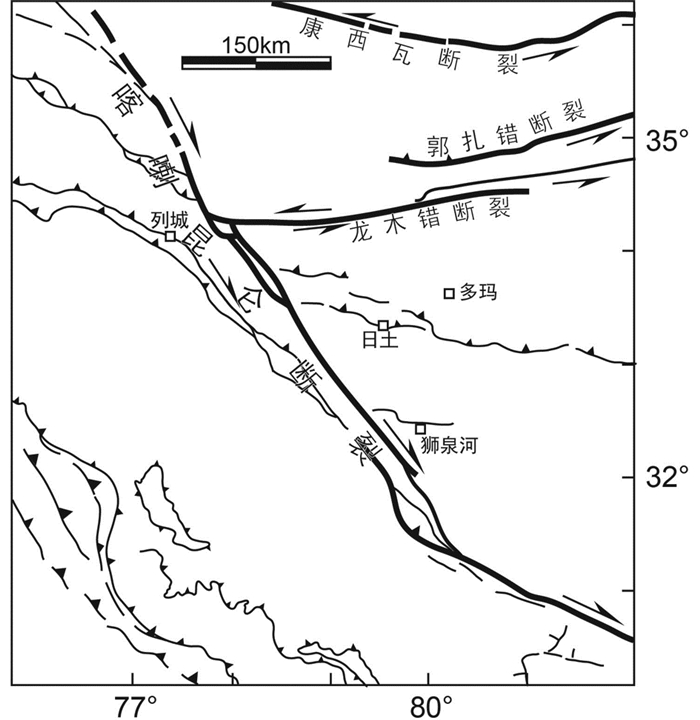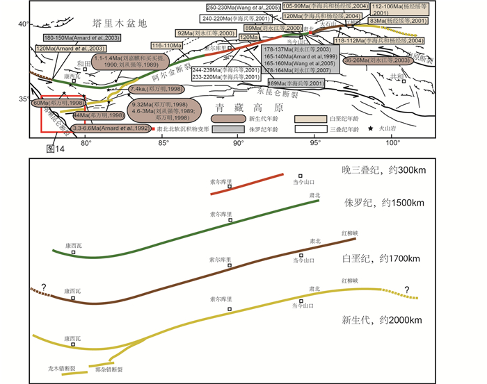 阿尔金断裂在新生代的活动同样表现为伴生的山体隆升和火山活动,断裂东侧山脉主要由南向北依次为党和南山、大雪山、祁连山和宽滩山,这些山脉隆升的年代可见相关讨论(Bichurf et al., 1989;Meyer et al., 1998;Metivier et al., 1998;Li et al., 1996;Fang et al., 2003, 方小敏等, 2004;Yin et al., 2002;Tapponnier et al., 2001;Wang et al., 2006;李海兵和杨经绥,2004),比较一致的观点是这些山脉是新生代以来欧亚大陆与印度洋板块碰撞的产物,也有人认为祁连山脉在白垩纪已经形成(李海兵和杨经绥, 2004),但阿尔金断裂东段山脉在新生代以来的强烈隆升已成为共识,最东端的宽滩山形成年代为全新世(李海兵和杨经绥,2004);断裂西段阿尔金断裂扩展形成郭扎错-龙木错断裂,该新生断裂直接切断了喀喇昆仑断裂(图 14),后者形成的时代在距今27Ma以前(李海兵等,2007),并且在阿尔金弧形转折端发生大量的火山活动(刘丛强等,1989;Arnard et al., 1992;刘嘉琦和买买提,1990;邓万明,2003),阿尔金断裂带形成现代近2000km的规模。