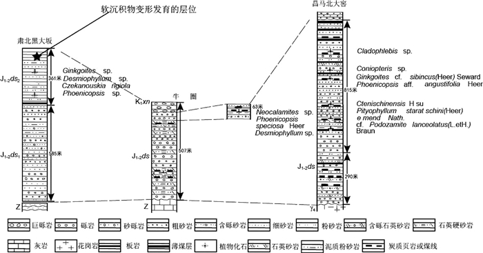 图 2 区域侏罗系大山口组对比(据甘肃省地质调查局,1977①) 发现的化石组合主要集中在J1-2Ds2中部,包含Ginkgoites sp.(似银杏), Czekanowskia rigida (坚直茨康诺斯基叶), Phoenicosis sp.(拟刺蔡) 和DesmioPhyllum sp.(带状叶),为典型的早-中侏罗纪化石组合,软沉积物变形出露在该套沉积地层顶部,为中侏罗世地层.剖面位置见图 1中红色圆圈 Fig. 2 Regional Jurassic lithological column comparasion Note the plants fossils are mainly locate in the middle part, including Ginkgoites sp., Czekanowskia rigida, Phoenicosis sp. and DesioPhyllum sp., which are typical fossil combination in Early-Middle Jurrasic epoch, the soft sediment deformations chiefly location in the upper Middle Jurrasic strata. See the red cycles in Fig. 1 for columms location |