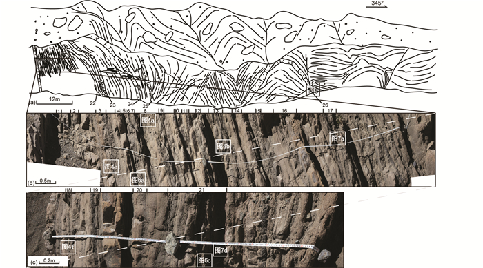 液化卷曲构造地震成因解释:地震成因的液化卷曲构造特征是卷曲的轴面排列没有特定的规律,也没有特定的剪切指向,这与韧性剪切带中形成的褶皱明显不同,后者应符合特定的剪切指向;液化卷曲构造一般与液化均一层共生,均一层通常出现在卷曲变形的顶部,代表强烈的液化形态,是粒度较细的颗粒液化挤出液化层,在其顶部形成的次生不具原始层理的均一层(Montenat et al., 2007)。软沉积物变形层26中,卷曲的轴面排列无定向,平行、垂直和斜交层理方向都存在,这种现象并不能用顺层滑动来解释,后者形成的褶皱应符合特定的剪切指向;卷曲层理往下、往上仍为平行层理,未见波痕和交错层理,由此推断该套软沉积变形同样与流水作用无关,是受强地震动影响而液化,在原地形成的构造现象。