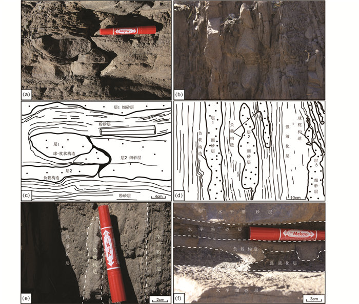 图 4 肃北剖面层8、13、3、18中记录的负载构造和球枕构造,分别对应照片(a)、(b)、(e)、(f) Fig. 4 Load and pillow structure recorded in layer 8, 13, 3, 18, corresponding photos are (a), (b), (e), (f), respectively |