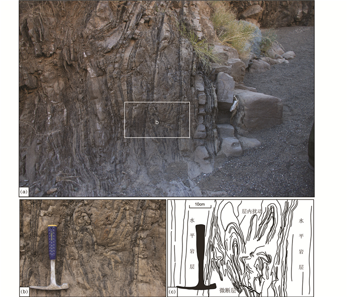 3.2 液化卷曲变形液化卷曲变形一般出现在薄层粉砂岩互层中,在强剪切力的作用下,未固结成岩的平行层理发生扰动卷曲。肃北侏罗纪剖面中层26是一种液化卷曲变形构造,如图 5a所示,在两端水平层所限定的范围内,粉砂层出现强烈的卷曲变形,并伴生一些黄色条状、球状砂岩块体。更精细的结构显示(图 5b) 这些水平层实际由多个细薄的粉砂岩层、泥质粉砂岩层共同组成,图 5b液化卷曲变形层总厚约30cm,粉砂层厚多在1~2cm之间,两侧为未变形的粉、细砂岩层,层厚较大,能干性较强的淡黄色粉砂层在层内破碎严重,在局部呈角砾状出现,基本难于辨认其原始层位分布。