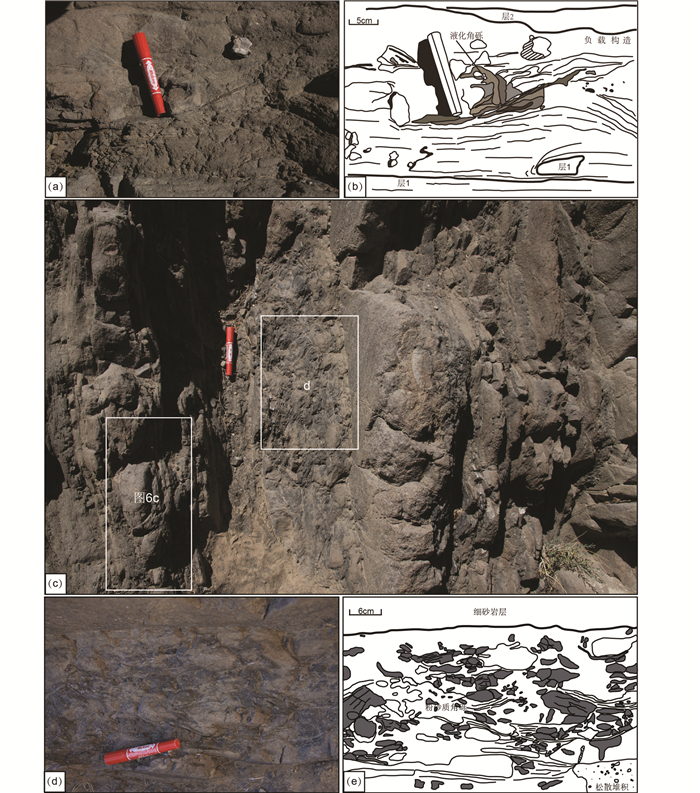 3.4 液化角砾当液化作用十分剧烈时,大量密集分布的砂岩脉体刺入围岩,将围岩分割成不同规格的细块状而形成的特殊岩层称为液化角砾岩。肃北剖面共揭示两层角砾化的岩层,层17和层21,共同的特点是液化角砾岩层上覆和下伏岩层都是扰动不甚剧烈的岩层,能辨认出较完整的水平层理(图 7),角砾都能鉴定出原岩的岩性,局部能分辨出原岩的层理面。层17中角砾呈拼贴状分布在图 7a中部,具有不同的形状和颜色,包括淡灰色的泥质粉砂岩块、淡灰黄色细砂岩块体、棕褐色细砂岩块体,围岩为淡灰黄色细砂岩,局部见层1中下陷的砂体和扰动的细层(图 7b);层21中角砾布局清晰,基本为黑色泥质粉砂岩和灰黄色细砂岩两种岩性(图 7d)。