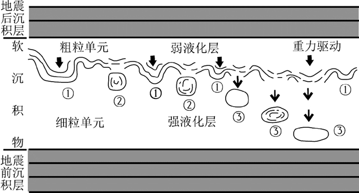 球枕-负载构造地震成因解释:球-枕构造是一个不包括成因的描述性的名字,最早由Smith于1916年提出,往往与负载构造伴生,负载构造则由Kuenen (1953)年提出,是在强地震动影响下的产物。形成机理为下伏细粒软弱层在强剪切力作用下,颗粒之间重新调整位置,孔隙水来不及排出致使孔隙水压力超出正应力,颗粒处于悬浮状态而丧失剪切强度,上覆软沉积物陷落入软弱层中而形成的一种特殊沉积构造,图 8为该过程的示意图;Moretti and Pieri (2002)的研究表明,负载体的长、短轴比与液化层的厚度和负载体的下陷距离有相关,液化层厚度、负载体的厚和运移的距离越大,负载体越扁。