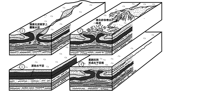 液化底劈构造地震成因解释:结合层6中发育的液化砂火山现象,图 9是对其形成机理的一种解释,地震发生前沉积层为具有原始水平层理的粉细砂层,在强地震动的影响下伏易液化层出现强烈的液化并刺穿上覆富含泥质的弱隔水层并喷出地表,后期再次接受堆积形成新的具有水平层理的粉砂层堆积,故图 8所揭示的厚约21cm的岩层组合至少反映了一次古地震事件,发生时间限定在顶、底部具水平层理限定的时间段之间,根据液化底劈构造出现的规模和底劈体的成分,我们推测这是一次能量较小的古地震事件,能量较大的地震往往会形成规模较大的底劈构造并且底劈体中可能会残留被刺入层的携入体(乔秀夫等,2012)