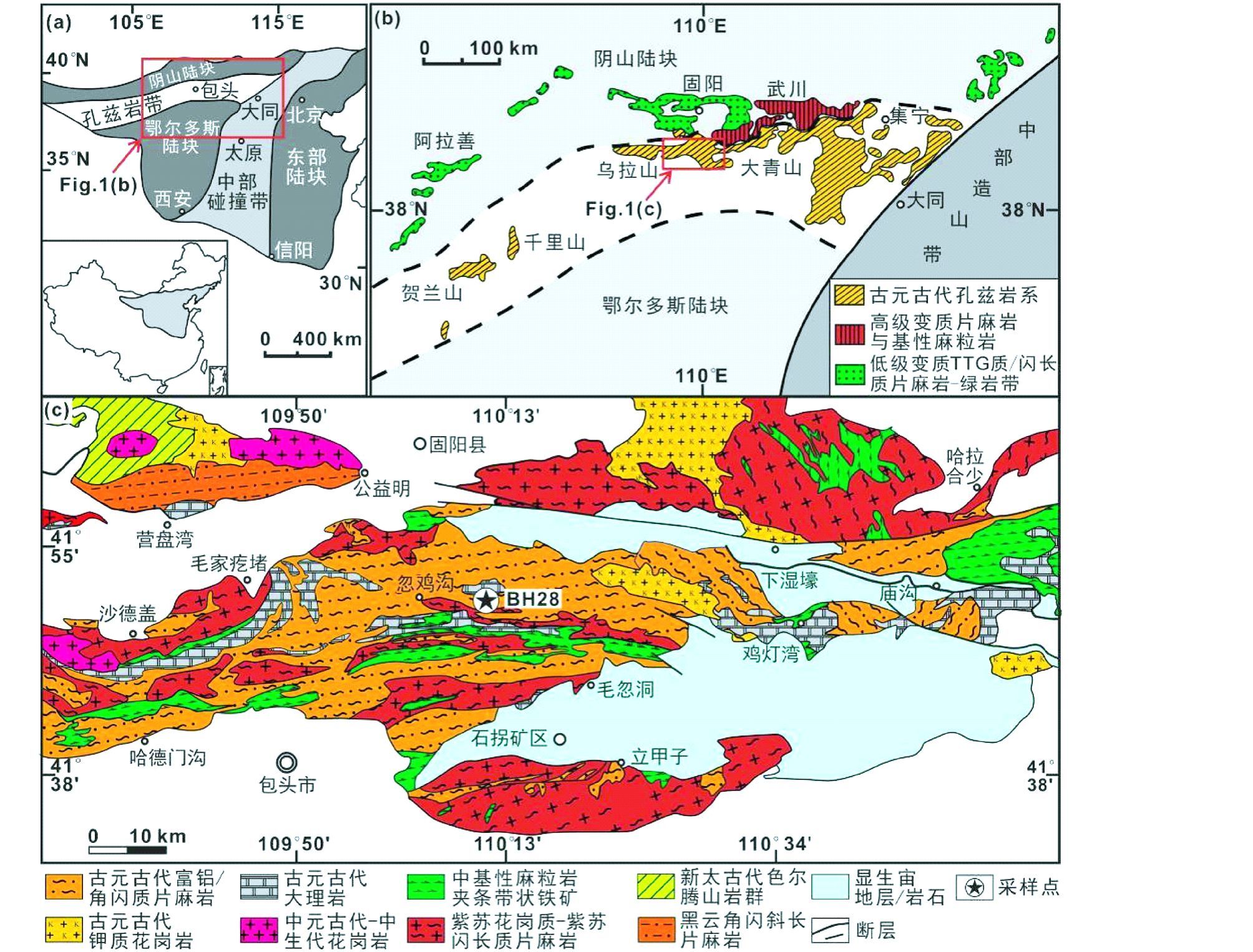 图 1 孔兹岩带在华北克拉通的分布和构造位置图(a,b,据Zhao et al., 2005)和大青山-乌拉山变质杂岩带的地质简图及采样位置(c,据徐仲元等,2007) Fig. 1 Distribution of Khondalite Belt in the North China Craton(a,b,after Zhao et al., 2005)and geological map of Daqingshan-Wulashan metamorphic complex belt(c,after Xu et al., 2007) |