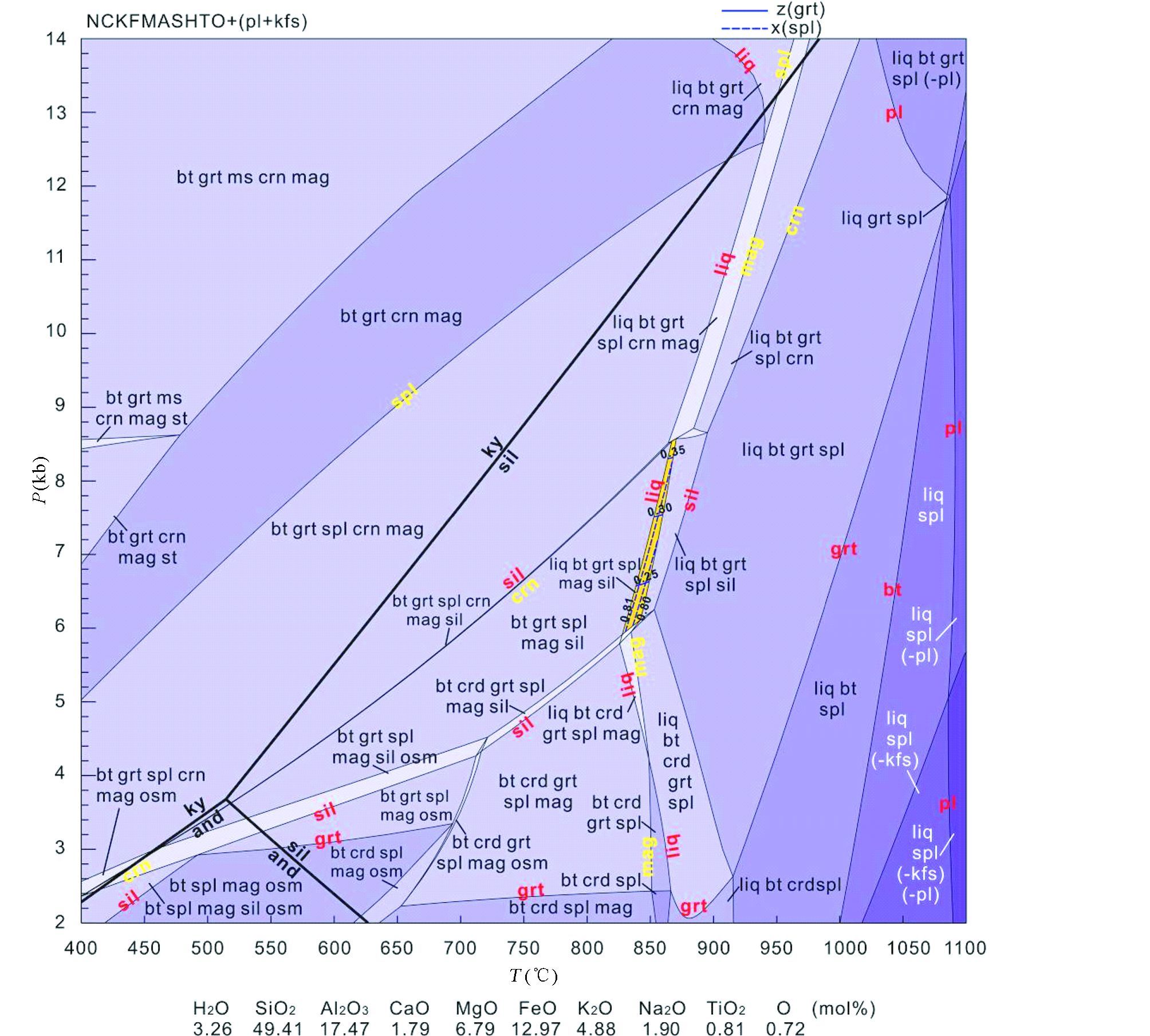 P-T视剖面图(图 10)中出现的贫Si矿物为尖晶石和刚玉。尖晶石的消失线(图 10中spl线)随着温度的升高向高压方向移动,石榴石的消失线(图 10中grt线)在920℃以下整体近平行于T(温度)轴,表明石榴石的分解受压力影响较大,而在920℃以上,石榴石消失线的变化趋势受温度的影响更大。相反,磁铁矿的消失线(图 10中mag线)近平行于P(压力)轴,说明磁铁矿主要受温度控制。固相线出现在~850℃,而通常变泥质岩的固相线出现在~650℃,这种差异的原因可能是贫Si残留体的原岩在~870℃形成了峰期矿物组合liq+bt+grt+spl+mag+sil+kfs+pl,并随着温度的降低至~850℃发生大量早期熔体的迁移,使得峰期矿物组合被保留,而不出现低熔组分(White et al., 2001)。通过石榴石幔-边部z(g)值(Ca/(Fe2++Mg+Ca))和基质尖晶石核部的x(sp)值(Fe2+/(Fe2++Mg))等值线的计算(图 10),确定峰期矿物组合bt+grt+spl+mag+sil+kfs+pl+liq稳定的温压条件在830~870℃和8.3~8.6kb,位于夕线石的稳定域。