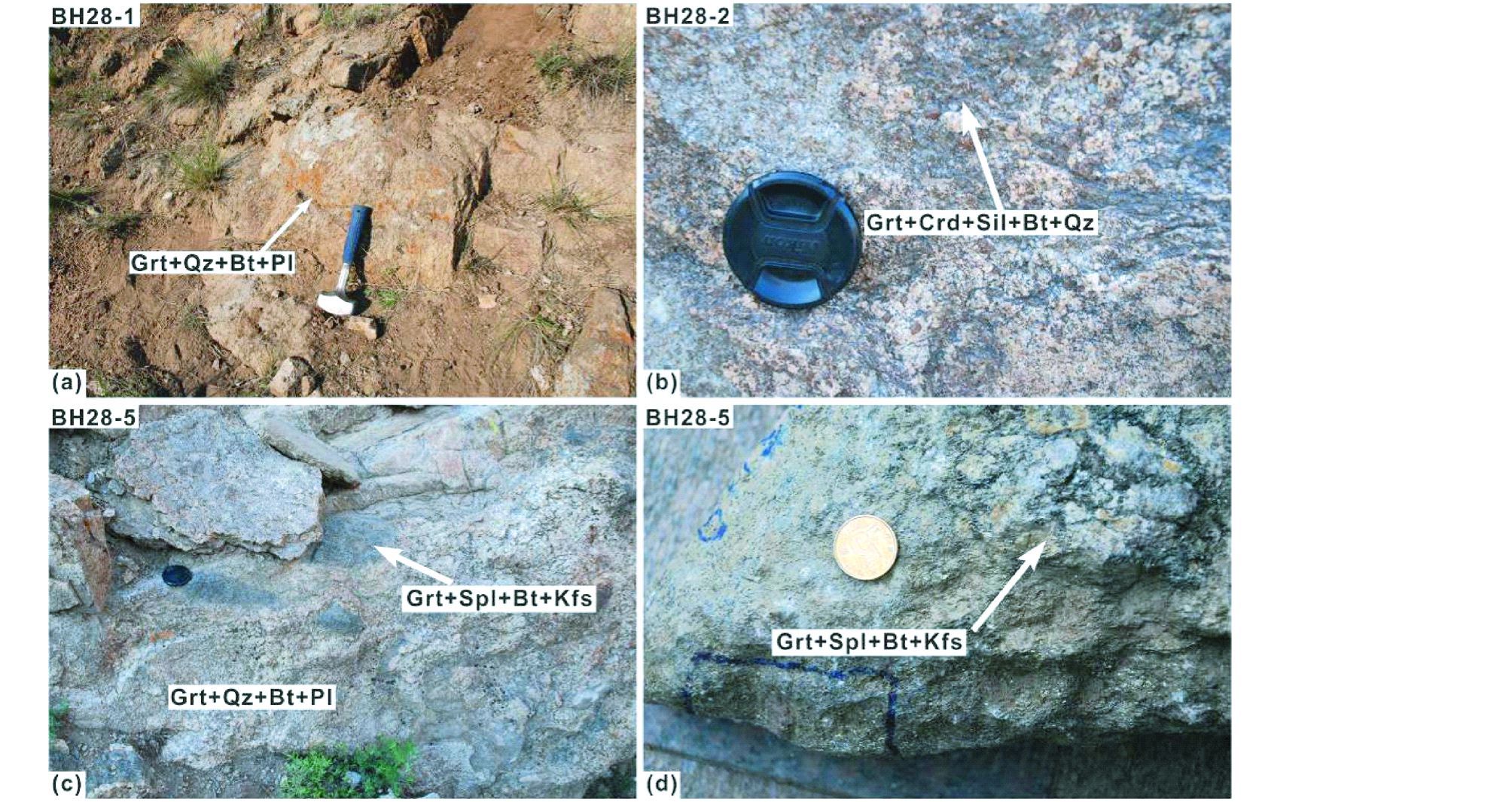 图 2 大青山-乌拉山变质杂岩带中大南沟地区各类片麻岩野外露头照片 (a)-石榴长英质粒状岩石(BH28-1);(b)-石榴堇青夕线二长片麻岩(BH28-2)中的石榴石变斑晶;(c)-含榴尖晶黑云钾长片麻岩呈透镜状产出于石榴长英质粒状岩石中;(d)含榴尖晶黑云钾长片麻岩(BH28-5)的矿物组合Grt+Spl+Bt+Kfs Fig. 2 Outcrops of typical Danangou gneisses from the Daqingshan-Wulashan metamorphic complex belt (a)-quartzo-feldspathic rocks(BH28-1);(b)-garnet porphyroblasts in garnet-cordierite-sillimanite-bearing paragneisses(BH28-2);(c)-garnet-spinel-biotite-bearing paragneisses as various lenses distributed within quartzo-feldspathic rocks;(d)-garnet-spinel-biotite-bearing paragneisses(BH28-5)with mineral assemblage of Grt+Spl+Bt+Kfs |