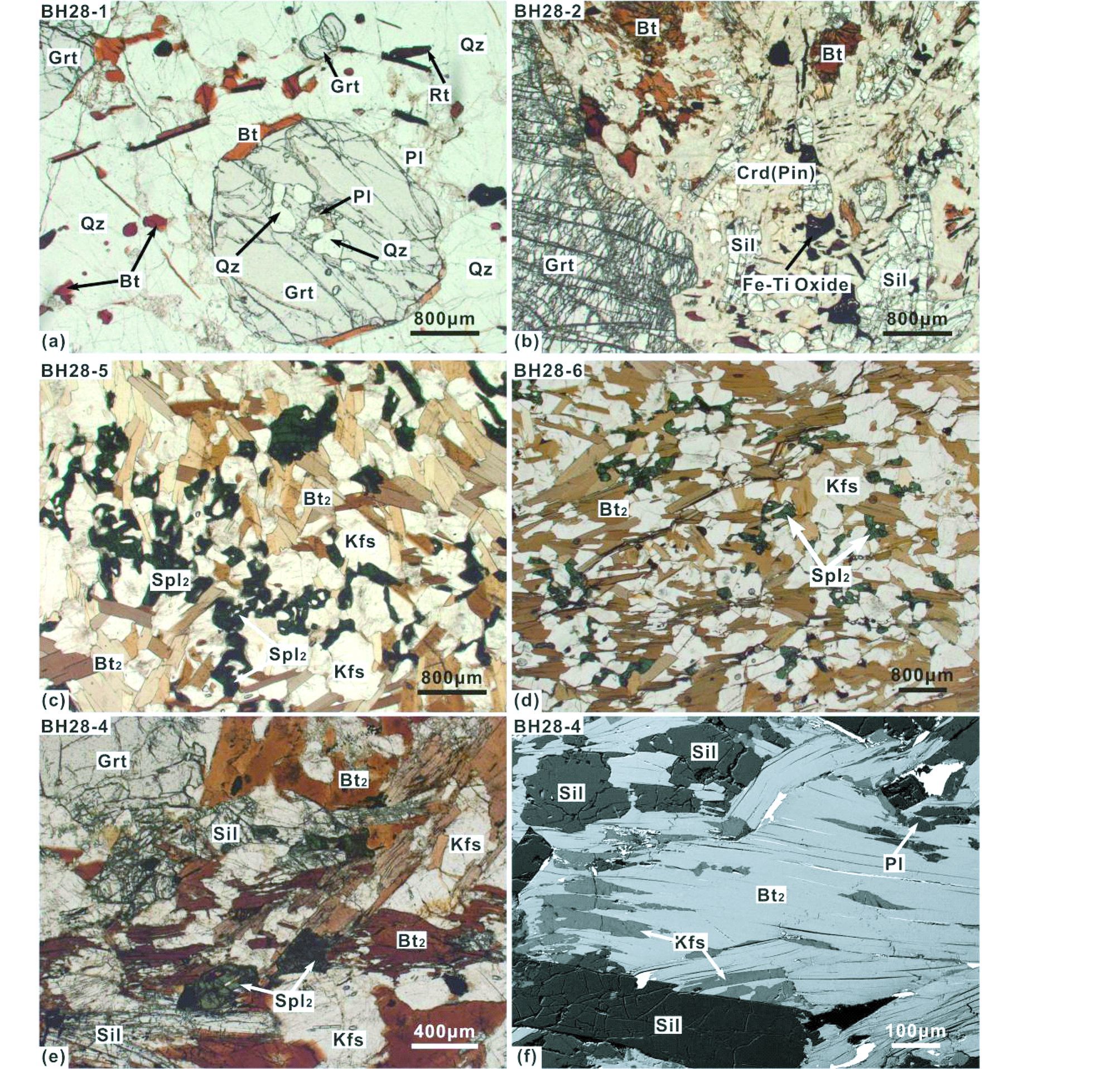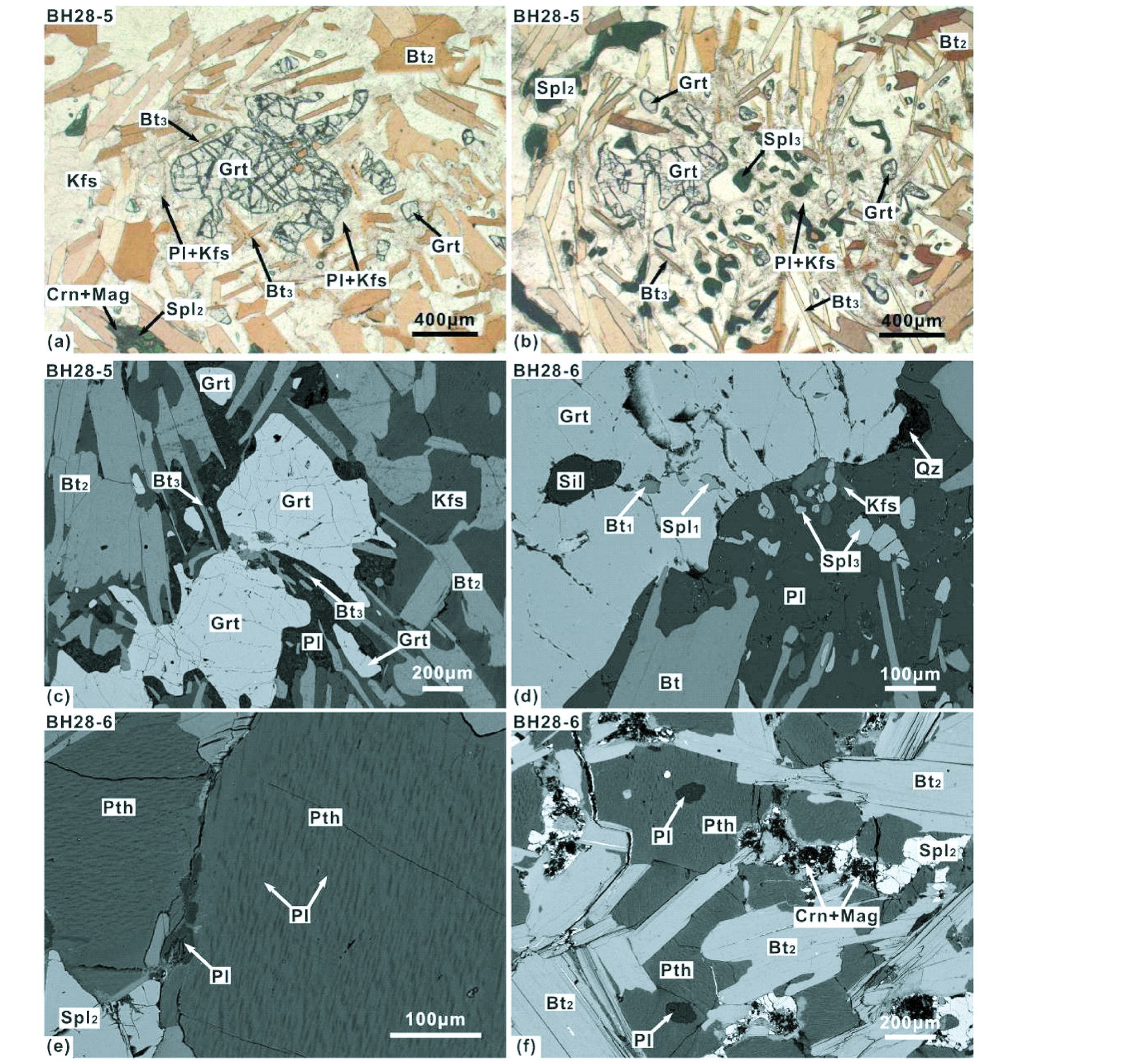 图 3 黑云石榴长英质粒状岩石(BH28-1)、石榴堇青夕线二长片麻岩(BH28-2)、含榴尖晶夕线黑云钾长片麻岩(BH28-4)和含榴尖晶黑云钾长片麻岩(BT28-5和BT28-6)显微结构照片 (a)-石榴石变斑晶内包裹浑圆状石英和斜长石,石榴石边部围绕黑云母和斜长石(PL图像);(b)-石榴石变斑晶边部出现堇青石(蚀变)反应边,堇青石中含有残留的夕线石、黑云母和Fe-Ti氧化物(PL图像);(c、d)-基质中的尖晶石、黑云母和钾长石(PL图像);(e)-石榴石、尖晶石、钾长石、黑云母和夕线石平衡共生(PL图像);(f)-黑云母脱水生成细粒钾长石和斜长石,沿黑云母解理缝方向分布(SEM图像) Fig. 3 Typical mineral assemblages and micro-textures in quartzo-feldspathic rocks(BH28-1),garnet-cordierite-sillimanite-bearing paragneiss(BH28-2),garnet-spinel-sillimanite-bearing paragneiss(BH28-4)and garnet-spinel- biotite-bearing paragneisses(BH28-5 and BH28-6) (a)-quartz and plagioclase as inclusions preserved in garnet porphyroblast which is surrounded by fine-grained biotite and plagioclase(PL);(b)-garnet relict rimmed by cordierite corona(pinitized)in which sillimanite,biotite and Fe-Ti oxide are preserved(PL);(c,d)-biotite together with K-feldspar and spinel as matrix minerals in garnet-spinel-biotite-bearing paragneisses(BH28-5 and BH28-6)(PL);(e)-garnet,spinel,K-feldspar,biotite and sillimanite distributed in the matrix of garnet-spinel-sillimanite-bearing paragneiss(BH28-4)(PL);(f)-K-feldspar and plagioclase as newly fine-grained minerals formed by biotite dehydration,and distributed along the cleavages of biotite(SEM) |
