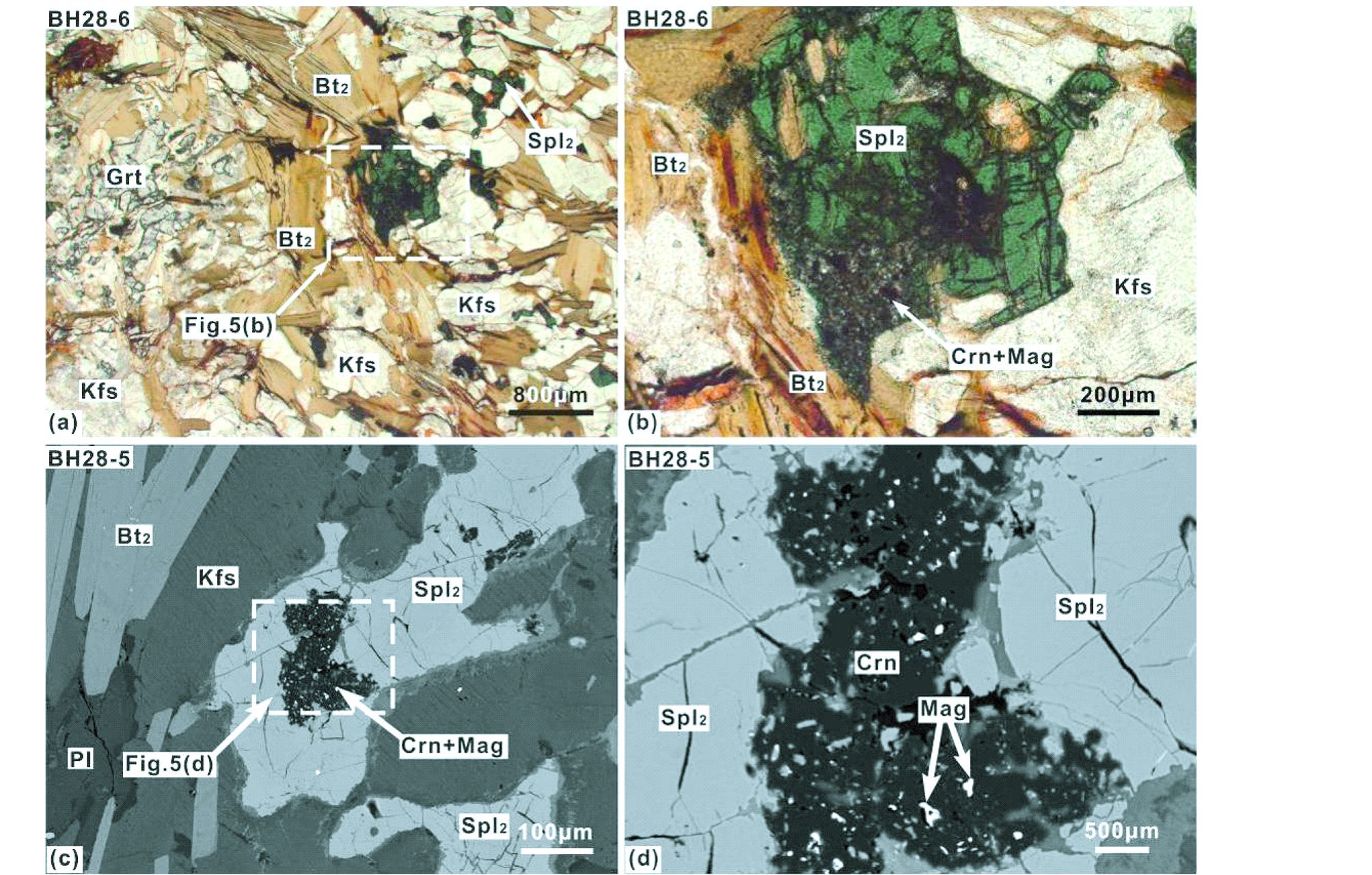 图 5 含榴尖晶黑云钾长片麻岩(BH28-5和BH28-6)矿物相转变反应结构显微结构照片 (a)-含榴尖晶黑云钾长片麻岩(BH28-6)主要组成矿物为石榴石+黑云母+尖晶石+钾长石(PL图像);(b)-图(a)局部尖晶石分解形成刚玉+磁铁矿的放大照片(PL图像);(c)-尖晶石转变为刚玉+磁铁矿的退变反应结构(SEM图像);(d)-图(c)中尖晶石转变为细小粒状刚玉+磁铁矿的放大照片(SEM图像) Fig. 5 Micro-textures of garnet-spinel-biotite-bearing paragneisses(BH28-5 and BH28-6) (a)-garnet,biotite,spinel and K-feldspar as matrix minerals in garnet-spinel-biotite-bearing paragneiss(BH28-6)(PL);(b)-magnified image of transformation reaction Spl→Crn+Mag as shown in Fig. 5(a)(PL);(c)-retrogressive texture showing reaction of Splss+O2→Spl+Mag+Crn(SEM)in garnet-spinel-biotite-bearing paragneiss(BH28-5);(d)-magnified image of transformation reaction Splss+O2→Spl+Mag+Crn as shown in Fig. 5(c)(SEM) |