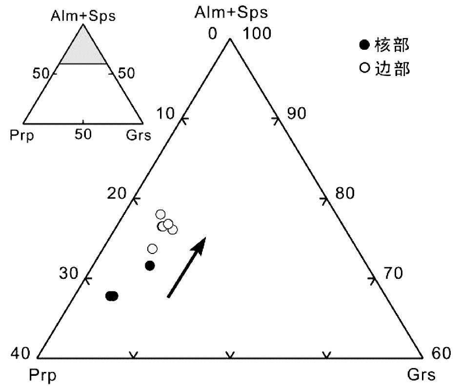 图 6 含榴尖晶黑云钾长片麻岩中石榴石的Prp-(Alm+Sps)-Grs图解 Fig. 6 Prp-(Alm+Sps)-Grs diagram of garnet from garnet-spinel-biotite-bearing paragneisses |