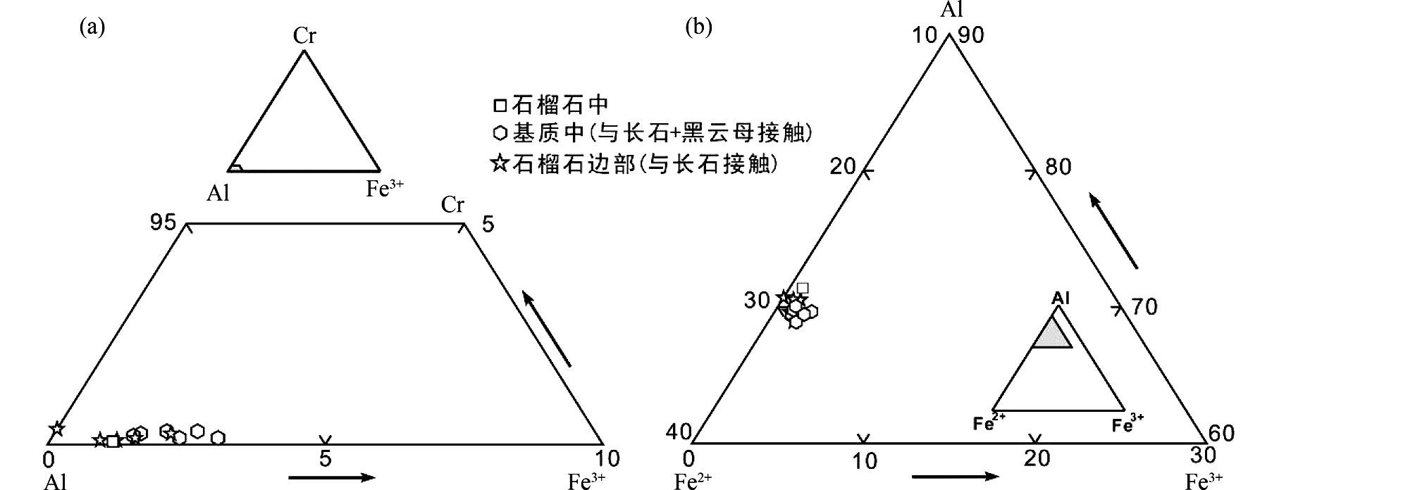 图 8 含榴尖晶黑云钾长片麻岩中尖晶石的Cr-Al-Fe3+(a)和Al-Fe2+-Fe3+(b)成分图解 Fig. 8 Compositional diagrams of spinel in garnet-spinel-biotite-bearing paragneisses |