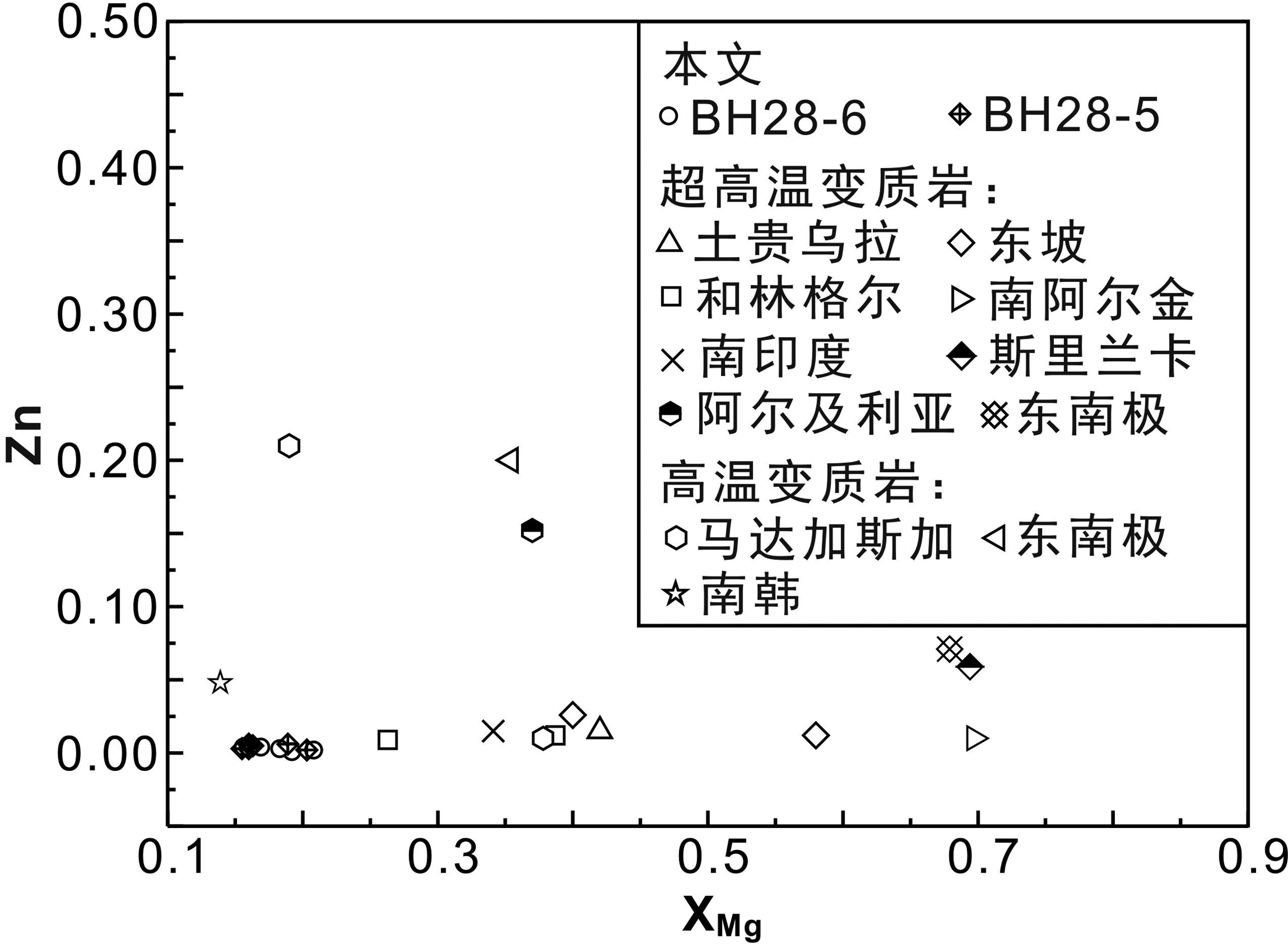 图 9 含榴尖晶黑云钾长片麻岩和其它地区高级变质岩中尖晶石的XMg-Zn图解 数据来源:超高温变质岩:内蒙土贵乌拉(Santosh et al., 2007);内蒙东坡(Tsunogae et al., 2011);内蒙和林格尔(Liu et al., 2012);南阿尔金(张建新和孟繁聪,2005);南印度Madurai地体(Sajeev et al., 2006);斯里兰卡Highland杂岩(Kriegsman and Schumacher, 1999);东南极Sør Rondane山脉(Asami et al., 2007);阿尔及利亚In Ouzzal地体(Ouzegane et al., 2003);中-高温变质岩:马达加斯加(Markl et al., 2000);东南极Jetty半岛(Hand et al., 1994);南韩Odesan地区(Oh et al., 2006) Fig. 9 Diagram of XMg versus Zn(a.p.f.u)for spinel in Danangou garnet-spinel-biotite-bearing paragneisses and high-garde rocks from worldwide terranes Data source: ultrahigh temperature metamorphic rocks: Tuguiwula,Inner Mongolia(Santosh et al., 2007); Dongpo,Inner Mongolia(Tsunogae et al., 2011); Heling’er,Inner Mongolia(Liu et al., 2012); South Altyn Tagh(Zhang and Meng, 2005); Madurai Block,southern India(Sajeev et al., 2006); Highland Complex,Sri Lanka(Kriegsman and Schumacher, 1999); Sør Rondane Mountains,East Antarctica(Asami et al., 2007); In Ouzzal terrane,Algeria(Ouzegane et al., 2003); Medium-high temperature metamorphic rocks: Madagascar(Markl et al., 2000); Jetty Peninsula,East Antarctica(Hand et al., 1994); Odesan area,South Korea(Oh et al., 2006) |