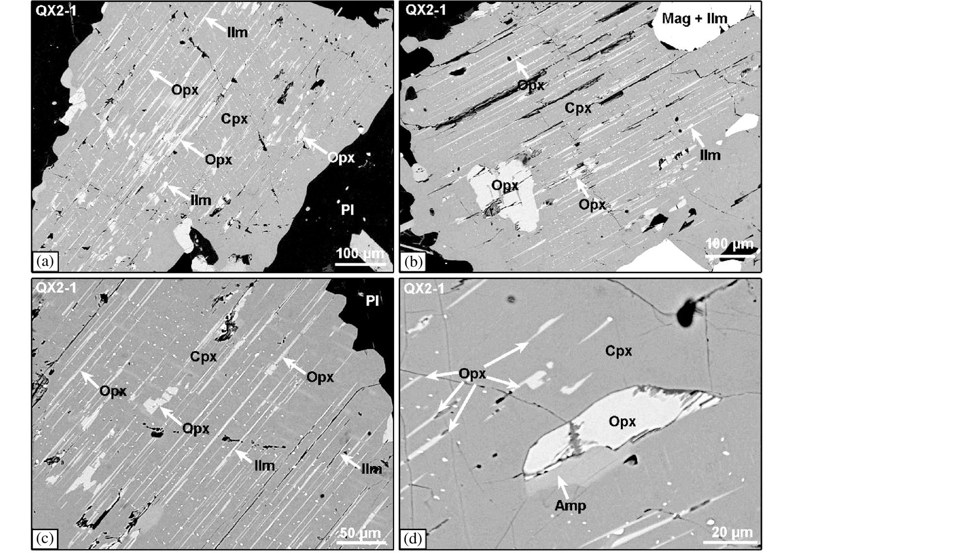 单斜辉石(Cpx0)→单斜辉石(Cpx1)+ 针状斜方辉石(Opx)+ 棒状钛铁矿(Ilm)。