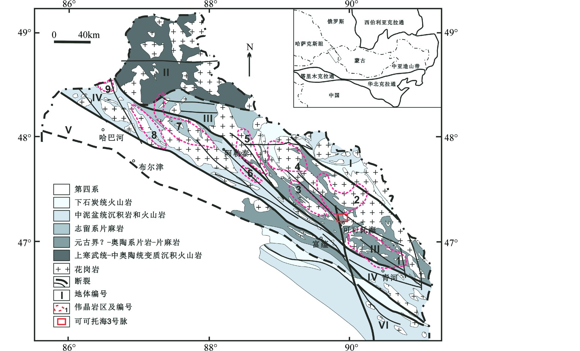 中国阿尔泰造山带内已发现的伟晶岩脉达10万余条,是我国重要的稀有金属、宝石、工业白云母成矿区。该成矿带包括2个稀有金属成矿亚带,分别为哈龙-青河成矿亚带和加曼哈巴-大喀拉苏成矿亚带;9个伟晶岩稀有金属矿集区,由西北向东南依次为加曼哈巴、海流滩-也留曼、小卡拉苏-切别林,大喀拉苏-可可西尔、卡拉额尔齐斯、柯鲁木特-吉得克、库威-结别特、可可托海和青河伟晶岩矿集区(图 1)(邹天人和李庆昌,2006)。从加里东期、海西期、印支期至燕山期均有伟晶岩及伟晶岩型矿床形成,由早至晚,元素和矿物组合越来越多、伟晶岩分带越来越完善、矿床规模越来越大、矿种由单一向综合演化(邹天人等,1986;王登红等,2004)。可可托海3号脉位于中阿尔泰山地体内,是该造山带内产出的规模最大结构最完整的伟晶岩脉。