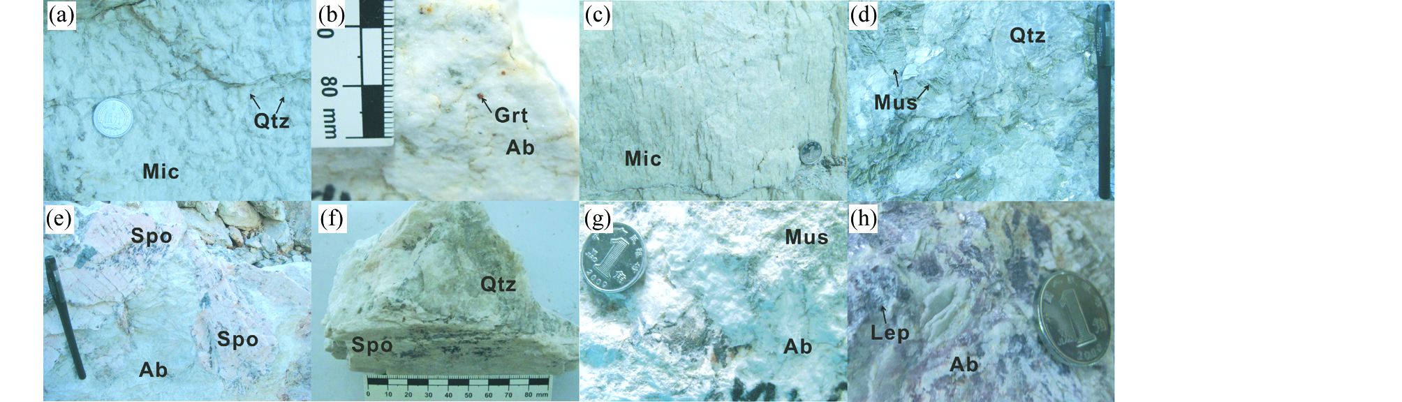 图 4 可可托海3号脉Ⅰ-Ⅷ带标本照片 (a)-文象结构带(Ⅰ带);(b)-细粒钠长石带(Ⅱ带);(c)-块体微斜长石带(Ⅲ带);(d)-白云母-石英带Ⅳ带;(e)-叶钠长石-锂辉石带(Ⅴ带);(f)-石英-锂辉石带(Ⅵ带);(g)-白云母-薄片钠长石带(Ⅶ带);(h)-锂云母-薄片钠长石带(Ⅷ带).Mus-白云母;Lep-锂云母;Ab-钠长石;Mic-微斜长石;Qtz-石英,Grt-石榴石;Spo-锂辉石 Fig. 4 Photos of Ⅰ-Ⅷ zones of the Koktokay No.3 pegmatite (a)-graphic pegmatite(zone I);(b)-saccharoidal albite(II zone);(c)-blocky microcline(III zone);(d)-muscovite-quartz(zone IV);(e)-cleavelandite-spodumene(V zone);(f)-quartz-spodumene(VI zone);(g)-muscovite-slice albite(VII zone);(h)-lepidolite-slice albite(VIII zone). Mus-muscovite;Lep-lepidolite;Ab-albite;Mic-microcline;Qtz-quartz,Grt-garnet;Spo-spodumene |