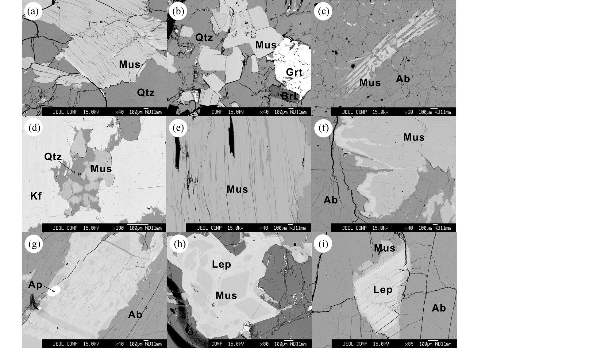 图 5 可可托海3号脉云母的背散射图像 (a)-Ⅰ带白云母,膝折;(b)-Ⅱ带中细粒白云母,与钠长石、石英和石榴石共生;(c)-Ⅱ带交代残余白云母;(d)-Ⅲ带白云母;(e)-Ⅳ带成分均一的巨晶白云母;(f)-Ⅵ带白云母,具有富锂蚀变边;(g)-Ⅷ带白云母与锂云母呈补丁分带;(h)-Ⅷ带锂云母形成后,沿其边界发育白云母生长边;(i)-Ⅷ带白云母形成后,沿其边界发育锂云母生长边.Mus-白云母;Lep-锂云母;Ab-钠长石;Qtz-石英;Ap-磷灰石 Fig. 5 BSE images of micas from the Koktokay No.3 pegmatite (a)-kinked muscovite from zone I;(b)-fine muscovite, assembaled with albite, quartz and garnet from zone II;(c)-muscovite with metasomatic and relict texture in zone II;(d)-muscovite from zone III;(e)-giant muscovite with homogeneous composition from zone;(f)-muscovite with Li alteration border from zone VI;(g)-patchy zonation composed of muscovite and lepidolite from zone VIII;(h)-lepidolite with muscovite growth edge from zone VIII;(i)-muscovite with lepidolite growth edge from zone VIII. Mus-muscovite; Lep-lepidolite; Ab-albite; Qtz-quartz; Ap-apatite |